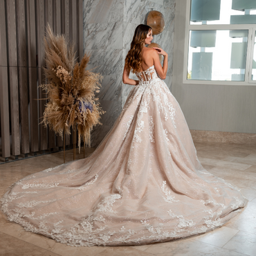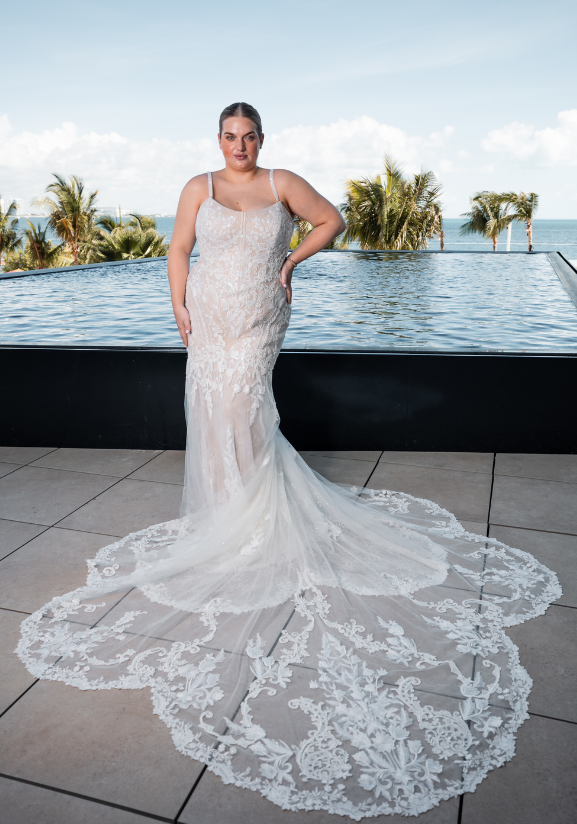 SIBYLLA x Édition, one of our favorites! Her curved neckline with the hand-beaded straps gives the perfect amount of support. We are obsessed with the linear lace design to accentuate the bride. It is simply *chef's kiss*!