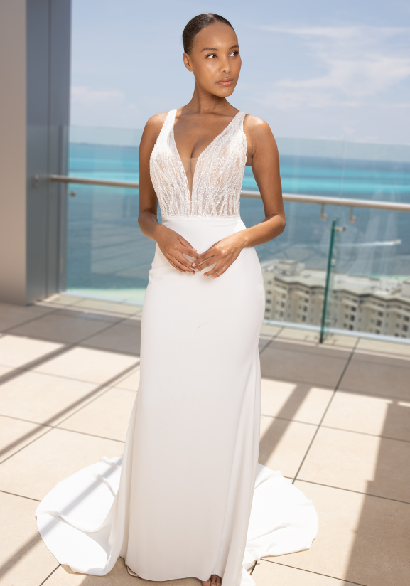 Be sure to dazzle on your big day with this absolute stunner! With the beaded linear bodice and stretch georgette skirt, this mermaid gown is a modern blend of minamalism and glamour. The plunging V-neckline, low back, and illusion side cut-outs add sexy touches to this captivating wedding dress.