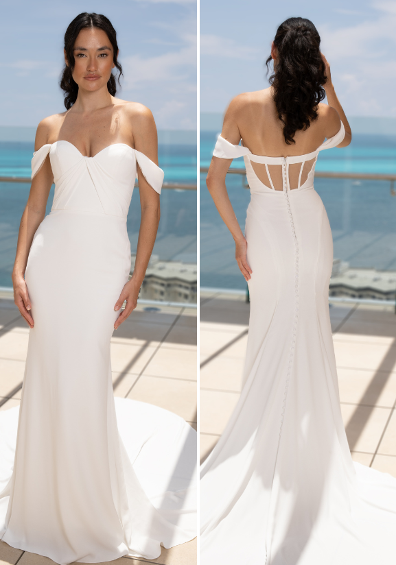 Bring out your inner glow with this bridal beauty! This flirty, figure-flattering mermaid gown perfectly hugs all your curves with its soft stretch georgette fabric. The off-the-shoulder sleeves and pleated bodice provide a graceful touch. You can't forget the illusion corset-style back and sweet buttons that delicately trail to the bottom of the train for an even more romantic feel.
