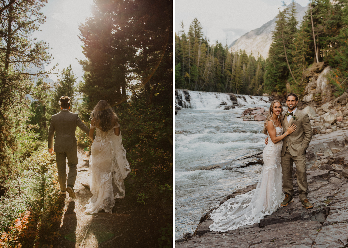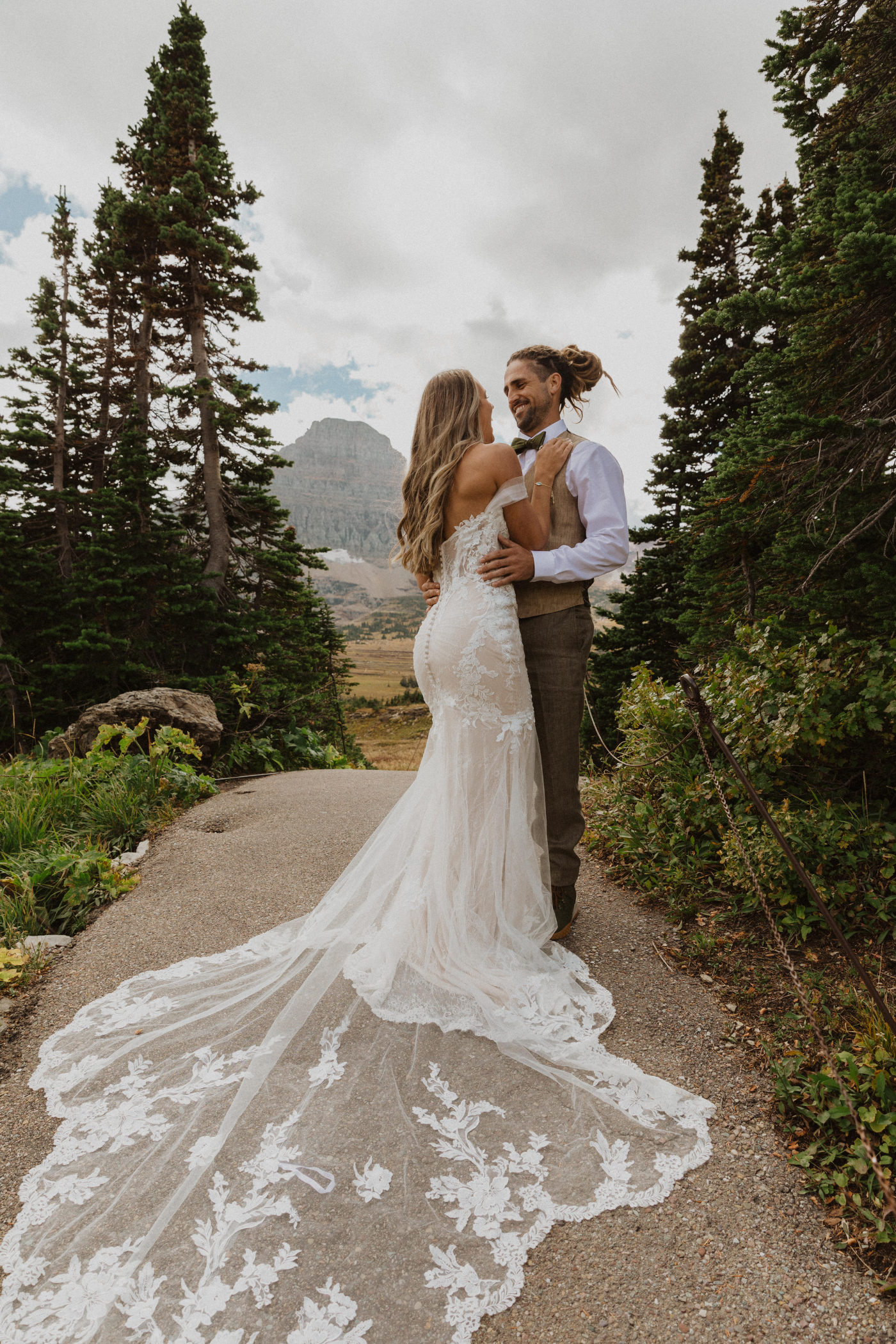 "They say when you find THE dress, you feel the prettiest you’ve ever felt in your entire life. The moment I tried EVANGELINE on, that fairy tale feeling came true. The mermaid shape and contouring lace pattern gave the gown that 'fits like a glove' feeling for me. The detachable off-shoulder straps were a fun, versatile detail that gave the dress a second look during our day. More than anything, I fell in love with the gorgeous blend of floral embroidered lace, Chantilly lace, and tulle. The soft, stretch jersey lining was incredibly comfortable for our day filled with hiking through the mountains. The dress was a perfect mix of elegance, contour, and comfort."