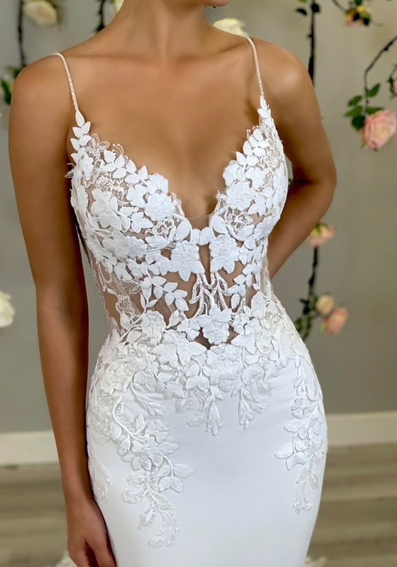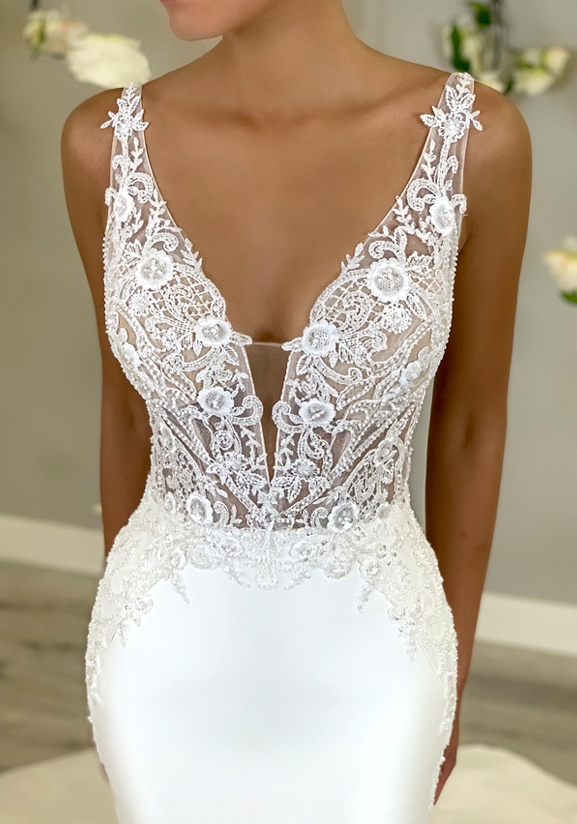 PASCALE’S modern, bold lace gives us super glam vibes and is amplified by the simply stunning stretch Mikado skirt and train. The beaded lace bodice will provide a subtle hint of sparkle while skimming over the hips for a sexy, body-contouring effect. Perfect for a delicate bride looking for a slight sparkle on her wedding day!