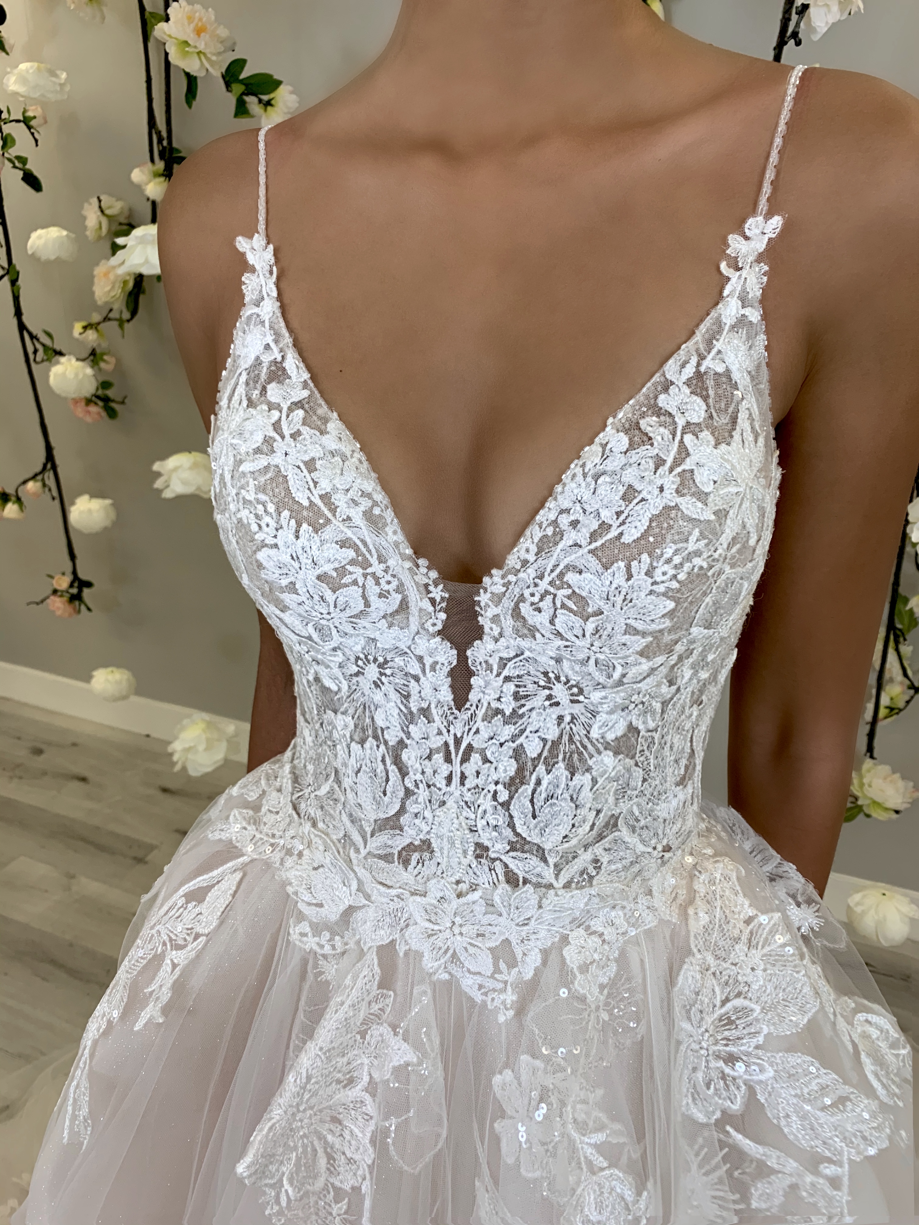 Looking for a little more lace detail? The lace detail on PAIGE continues past the bodice and cascades down the incredible full tulle skirt! If an all-over lace skirt isn’t for you, then lace appliques are a lovely way to add detail across the skirt of your gown without adding too much. It means you can focus that detail in a specific area – around the base of the skirt, or lightly scatter it across the whole thing!