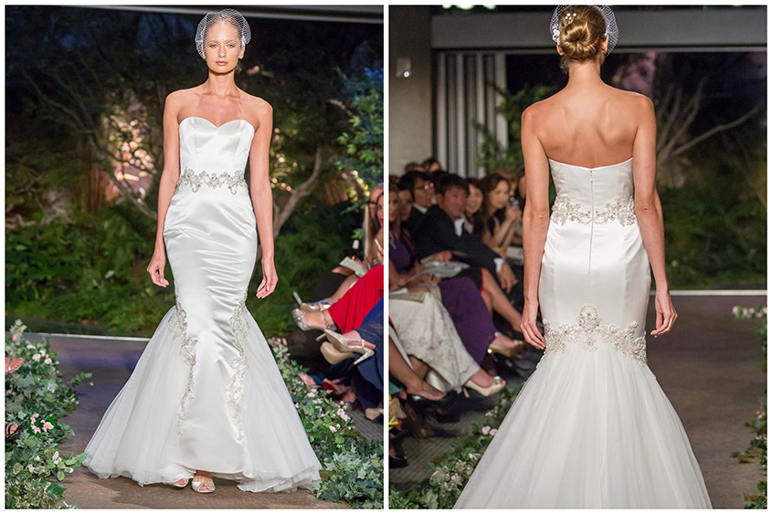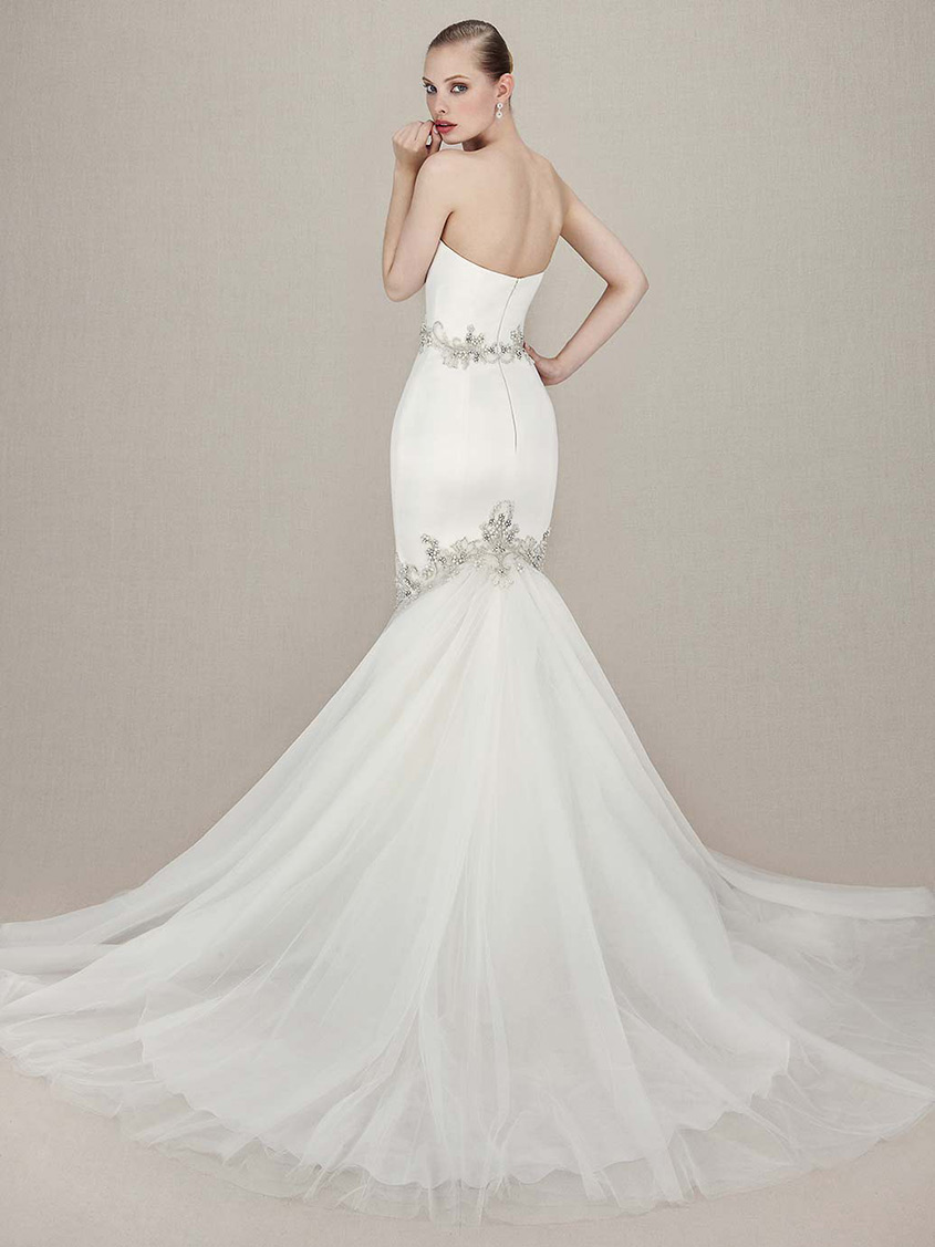 Pictured above on the 2015 Enzoani Fashion Event runway, Kenzi also features an invisible zipper back closure for the cleanest look. We feel simplicity is key for Kenzi, so pairing with a birdcage veil will enhance the couture look and and add a little edge to this simply stunning silhouette.