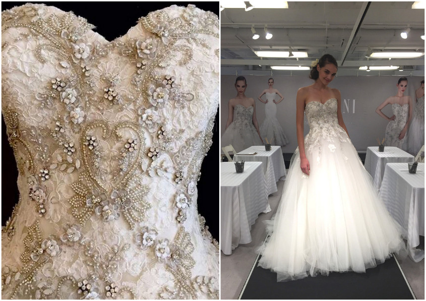 Pictured Above (Left to Right): A close-up look at Kristiana's beaded bodice via Uptown Bridal; Kristiana on the Enzoani runway at the National Bridal Market 2015 in Chicago