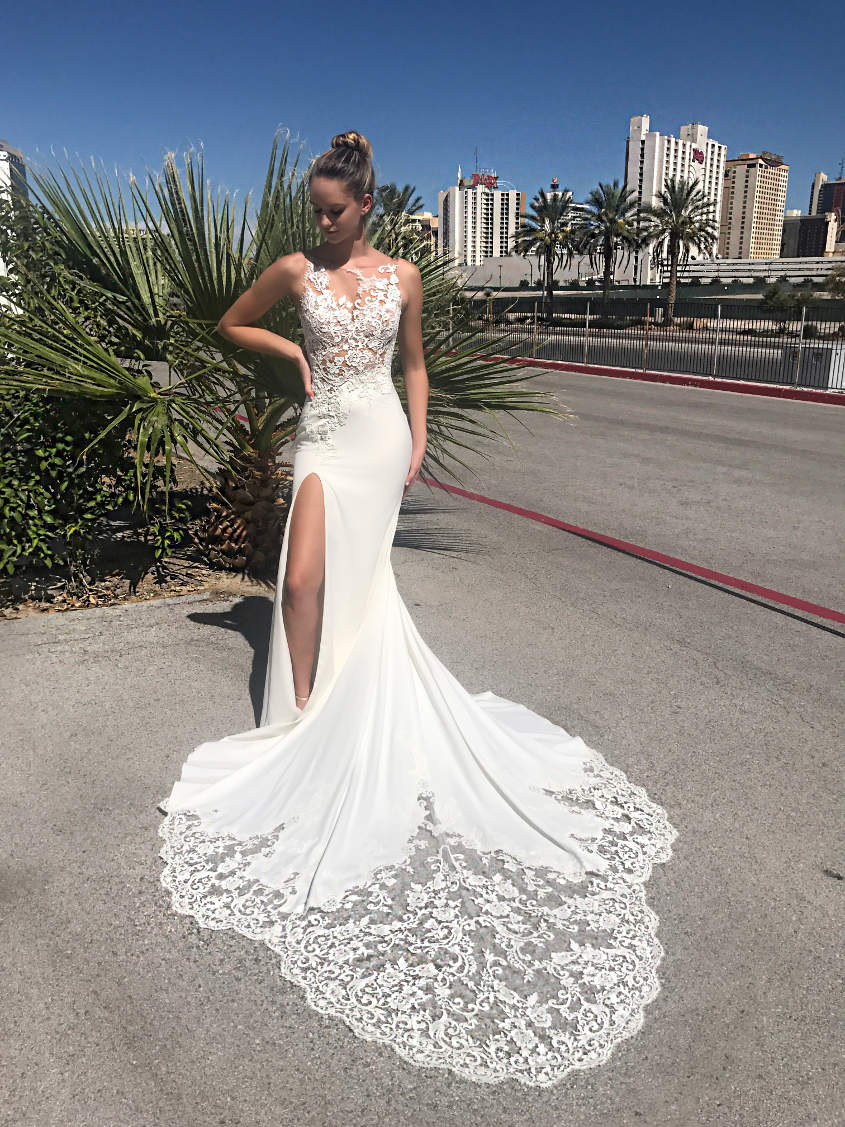 The alluring unlined, illusion lace bodice on Margo is perfectly balanced with a soft crepe skirt featuring a showstopping side split to show off those legs.