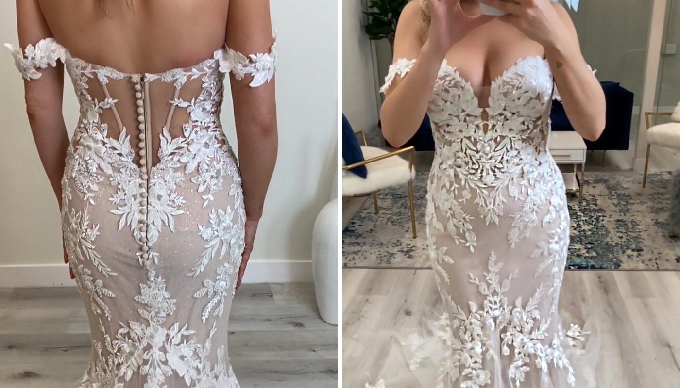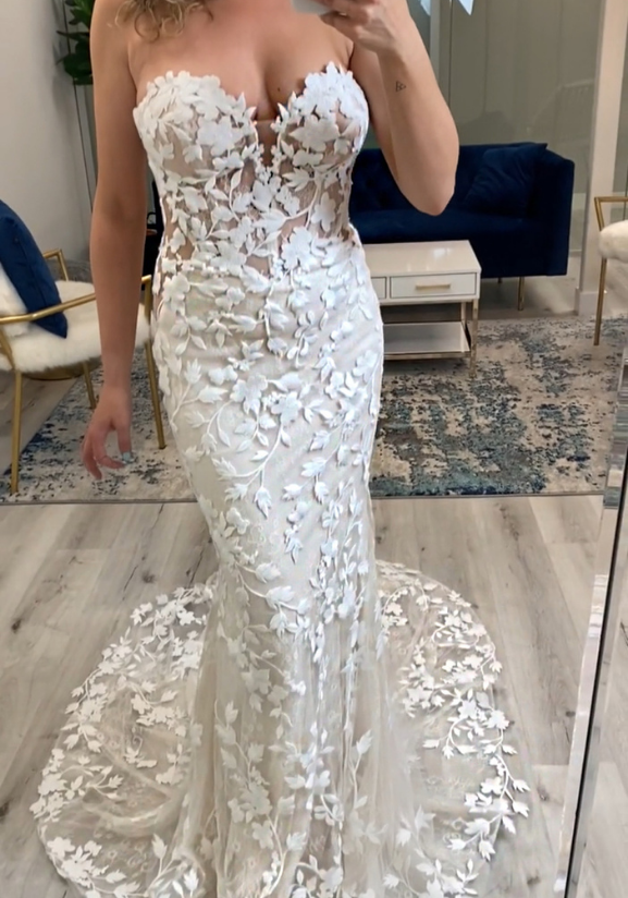 "Ooh la la, it’s ORRIE. ORRIE is for those of you that are Blue by Enzoani fans and followers, you’ll recognize this lace from some of our previous collections. It’s really just a little bit more textured, a little bit chunkier, so you really get some dimension on this dress. This has a sand lining so you get that lace that really kind of pops off of the lining, just for a little bit more texture. I love the bodice. You again have that sheerness so you then again get these cutouts, very sculpting. Just a really beautiful kind of modern take on a classic lace strapless gown. The shape is unbelievable, the fit is unbelievable. I just love the overall look of this. This is ORRIE, and she is a full lace goddess. The train is beautiful -- we have again, just all full lace, all the way through."