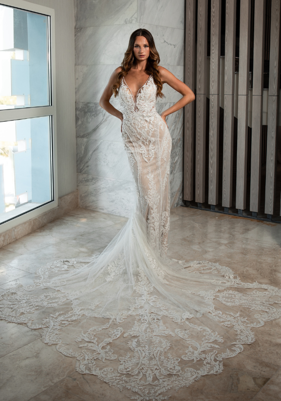 DAPHNE leaves us in awe with her unique linear lace design. This is definitely one of the most eye-catching gowns in this collection with her plunging neckline and her sparkles.