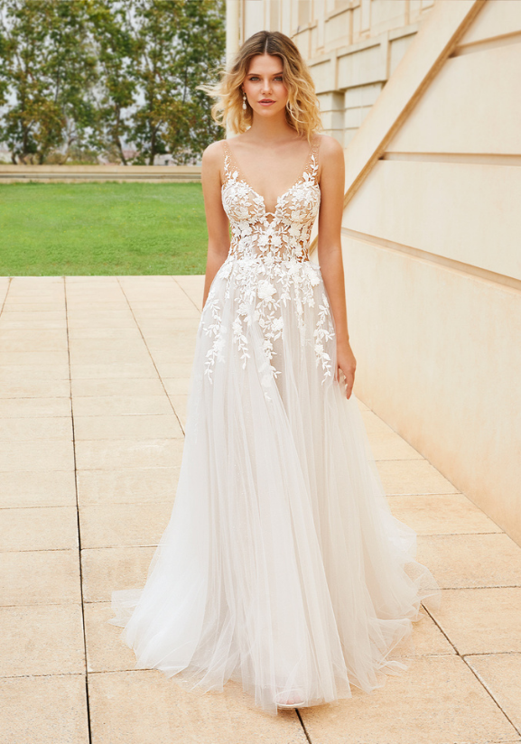 We are in A-line heaven... Olani is the a picture-perfect fairytale wedding dress. Her beautiful floral embroidered lace gorgeously trickles down to the dreamiest organza that will leave your guests breathless.