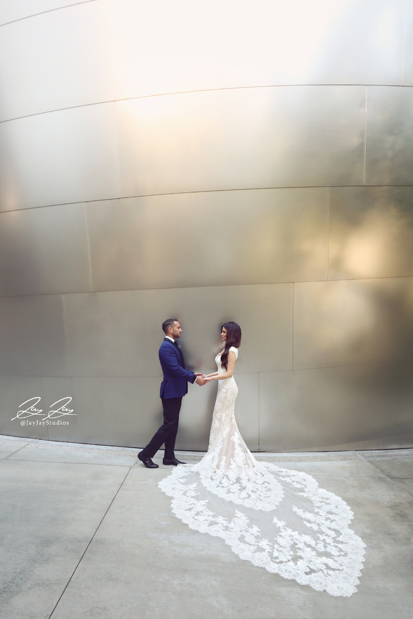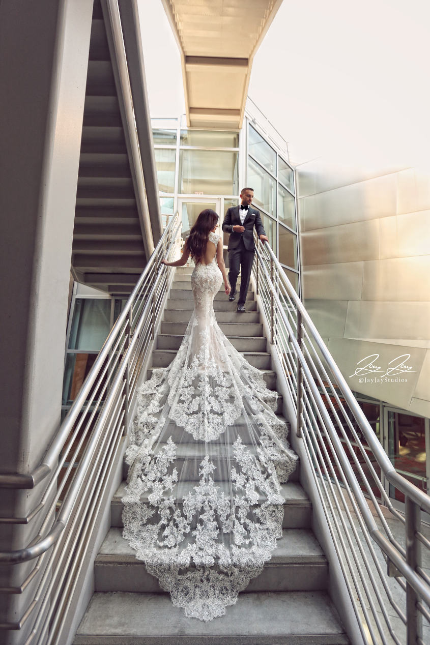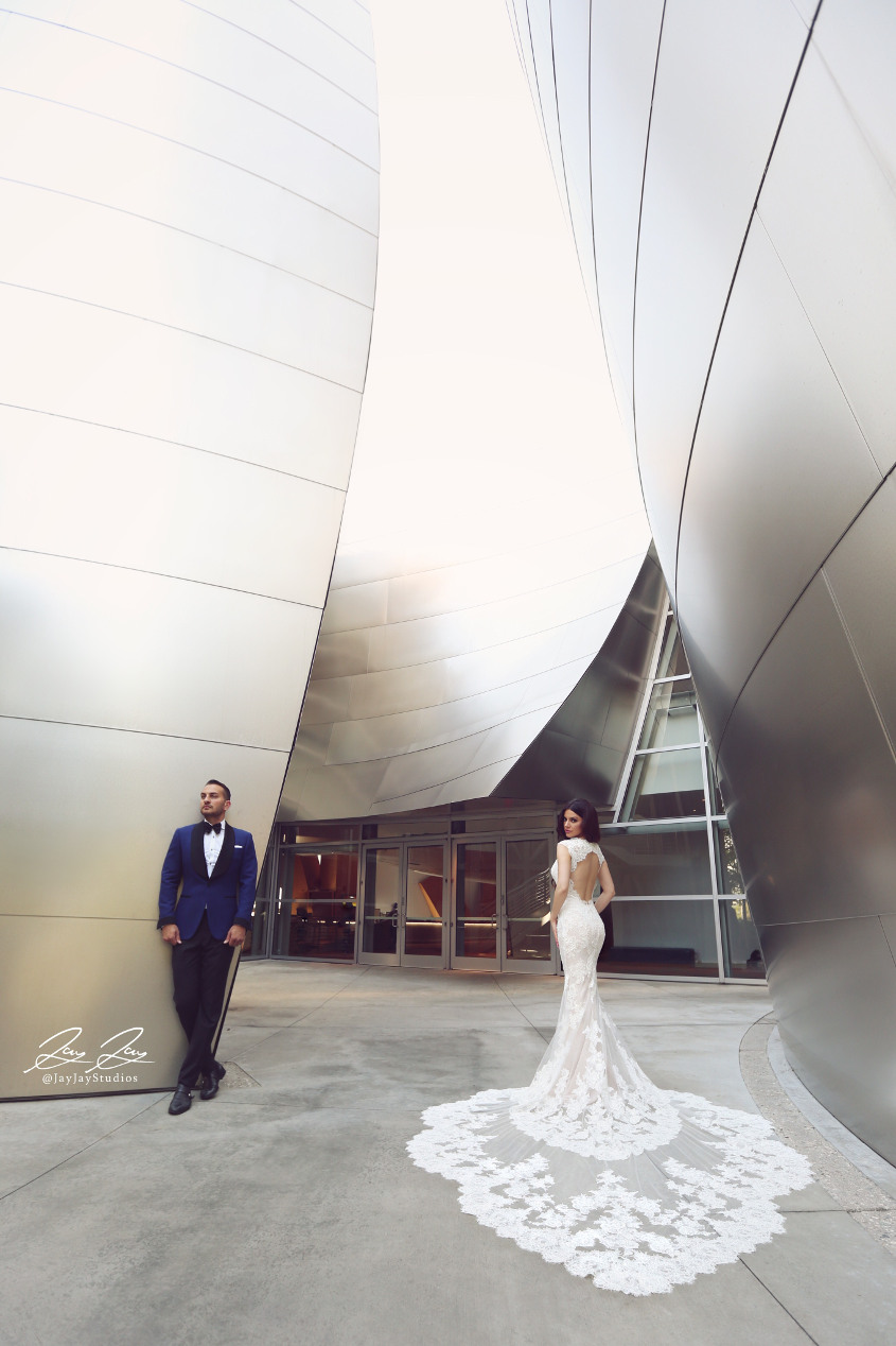 The majestic, modern exterior of the Walt Disney Concert Hall in downtown Los Angeles set the perfect scene for "A Modern Twist" styled photoshoot featuring the Morgan gown from our 2018 Enzoani collection. With the talents of photographer Jay Jay of Jay Jay Studios, models Linda Chiriac (who also did hair and makeup) and Arsen B, and Men's Custom Attire by William and Company, the collaborative shoot produced a fresh and stunning take on modern wedding photos. Check out pictures below of Morgan's dramatic lace train highlighted against the clean lines of the concert hall, and get inspired for your own aisle style. Find an authorized Enzoani retailer near you to contact about the gown.