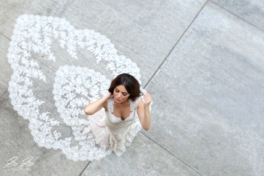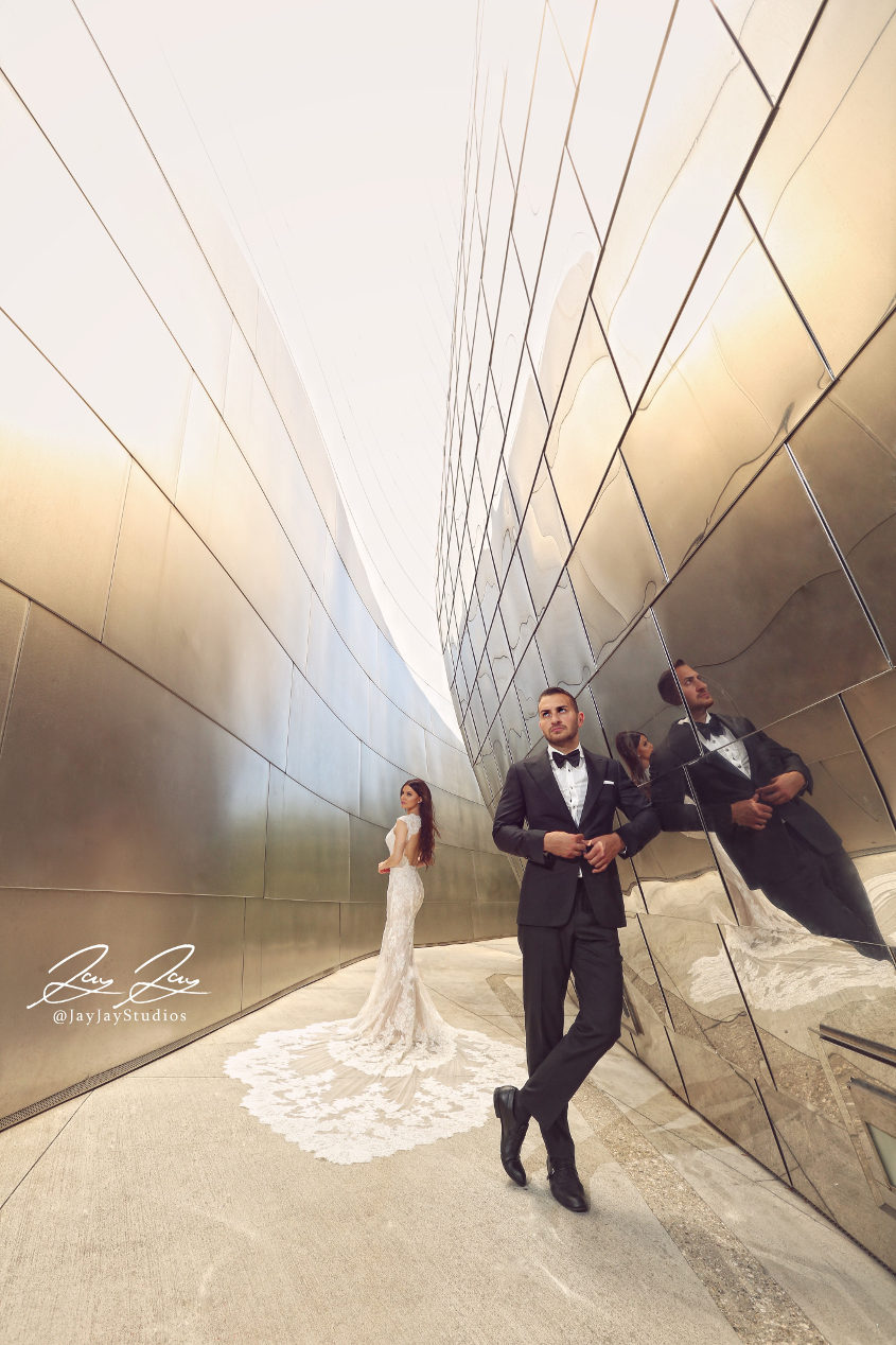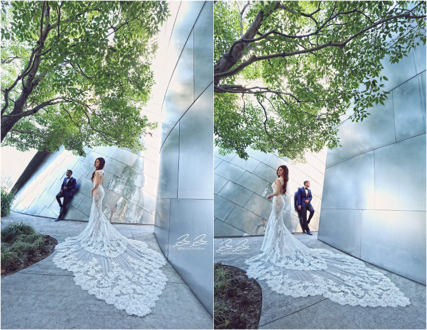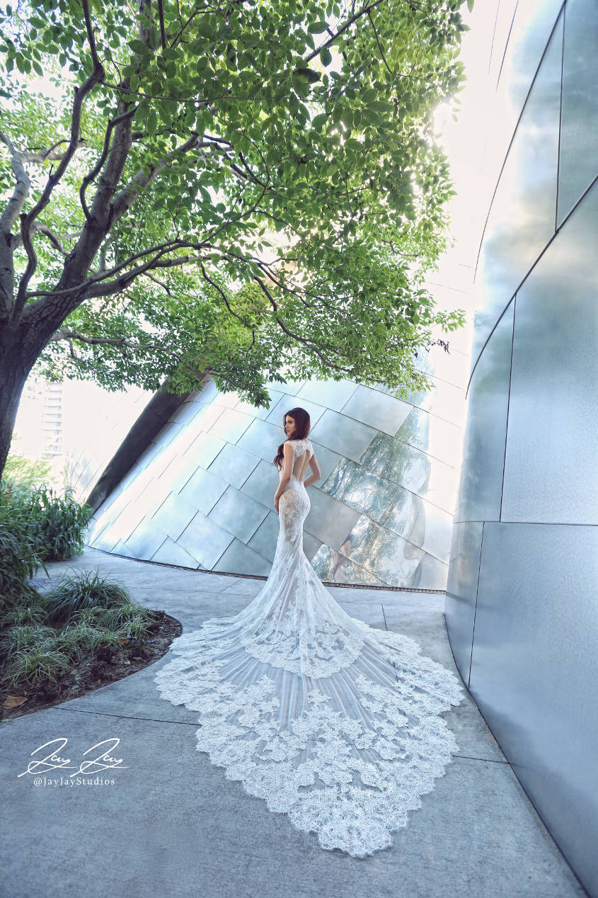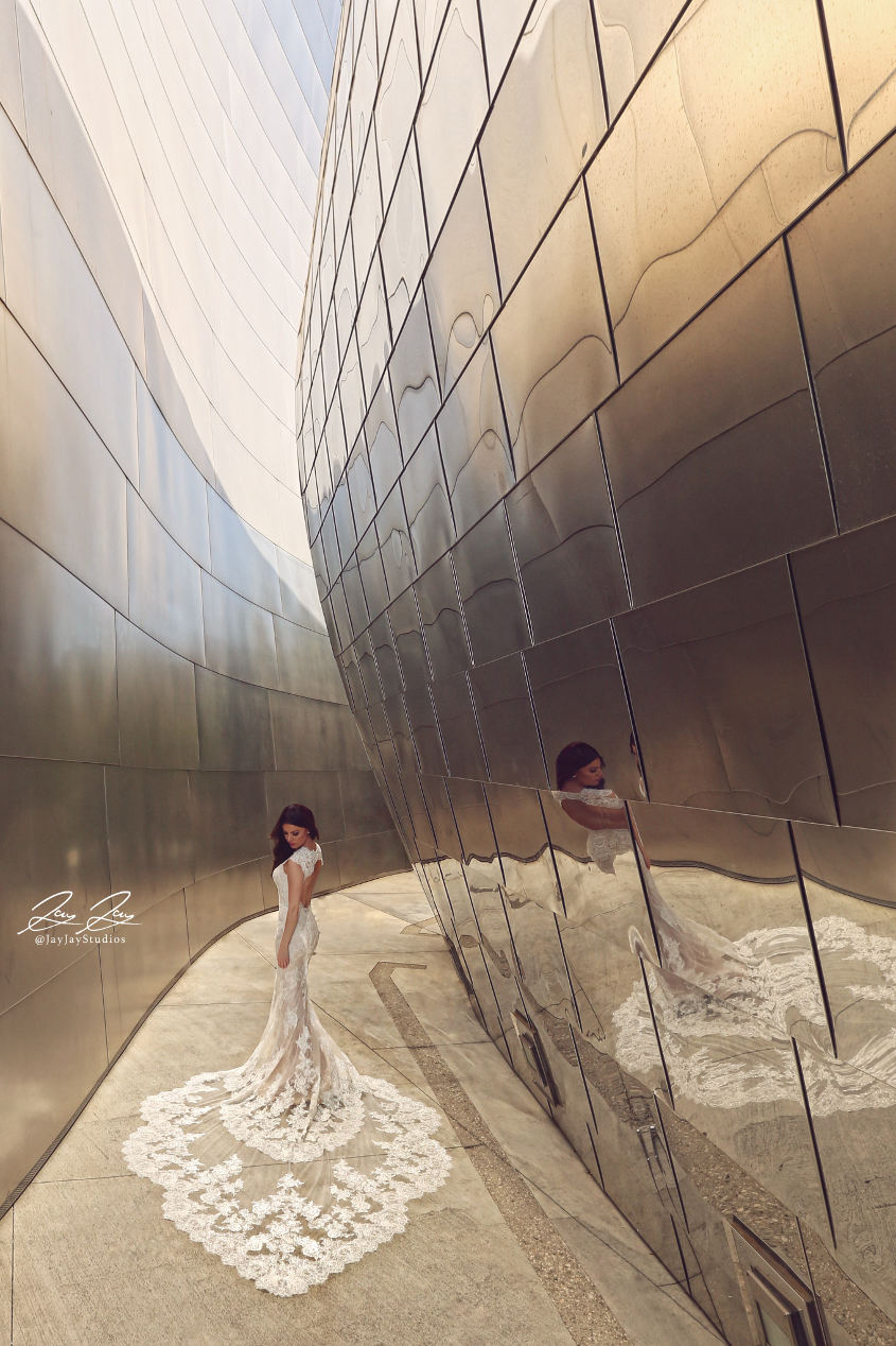 Photographer Jay Jay about the shoot location: "We wanted a modern touch to the backdrop, since modern is the 'thing' now. We wanted to give a futuristic feel with a timeless dress. I'm a big fan of Back to the Future movies, so this kind of all made sense in its own way."
