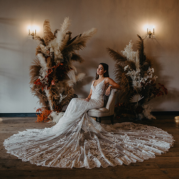 Who doesn’t love a good staircase shot? The perfect place to show off this stunning, sexy, back detail on the BT18-02 gown. A show-stopping choice to leave all your guests ooh-ing and ahh-ing as you glisten down the aisle.