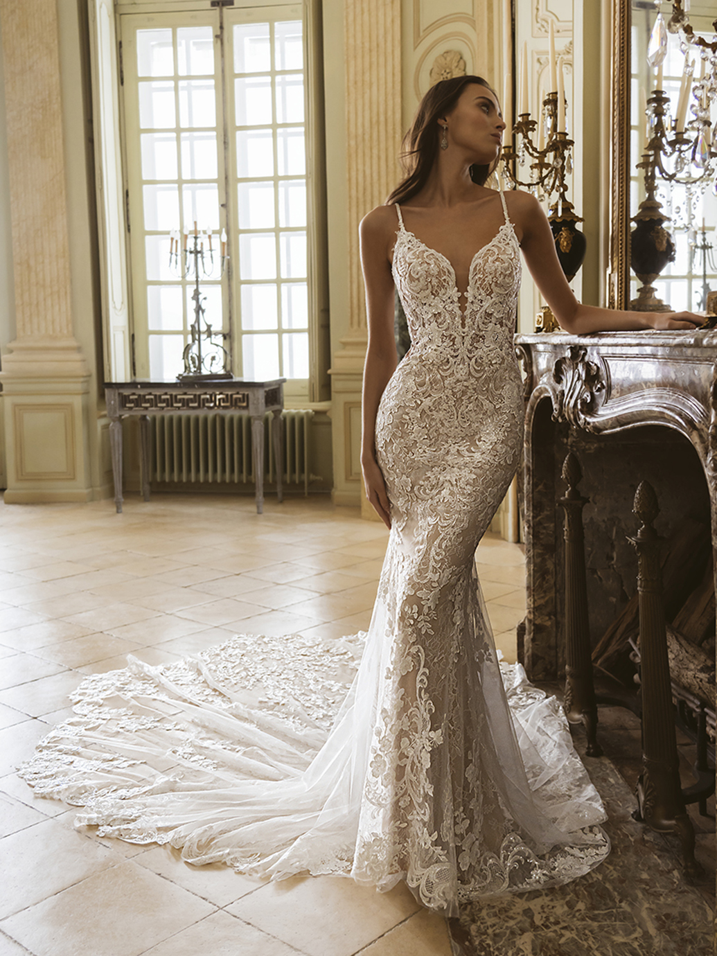 Introducing the mesmerizing GEM wedding gown from the Élysée collection! Crafted in ethereal baroque lace and lush floral embroidered lace, this romantic mermaid silhouette is a true masterpiece. The striking V-neckline elegantly frames the décolletage, while the backless design adds a touch of allure.