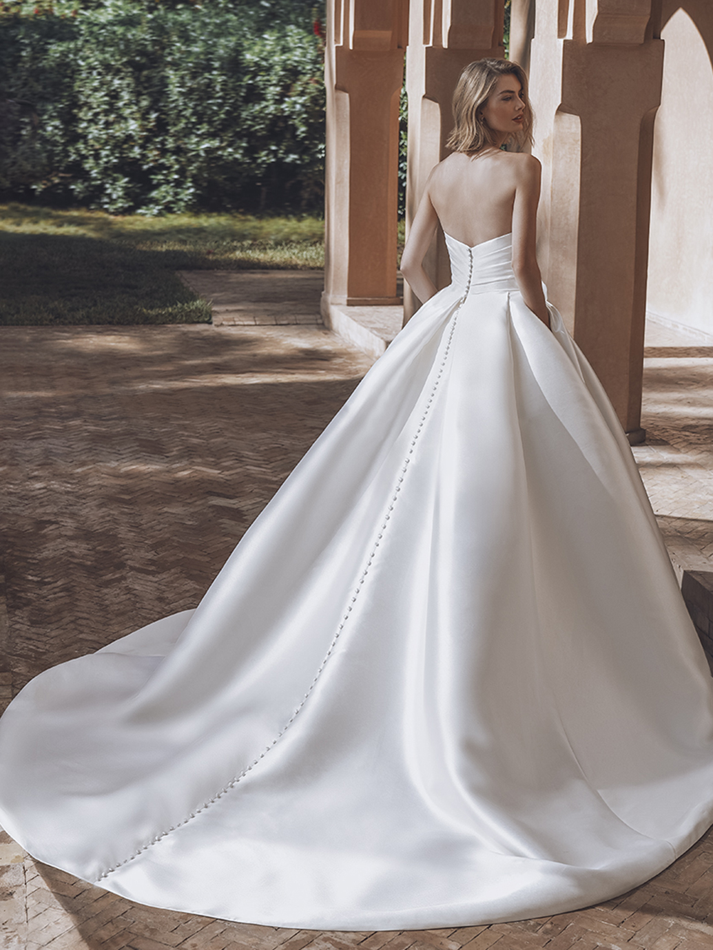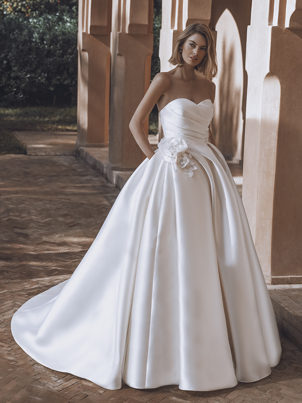 Make a statement in sophistication with this Mikado ball gown dream, ULIANA. This bridal beauty features a romantic sweetheart neckline with detachable off-the-shoulder straps and a voluminous skirt accented with 3D flowers on the waistline. The gorgeous textured draping detail on the bodice flows seamlessly into the pleats of this skirt for a magnificent fairytale effect.