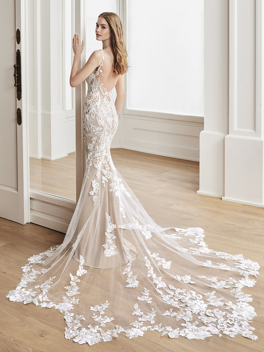 A sexy all-over lace mermaid gown to bring the WOW factor to your wedding day! This ultra-romantic gown features exquisite floral lace straps supporting the sparkling lace bodice that features illusion side cut-outs for a figure-flattering look. We also can’t take our eyes off of the captivating, plunging back and sculpted illusion lace train!