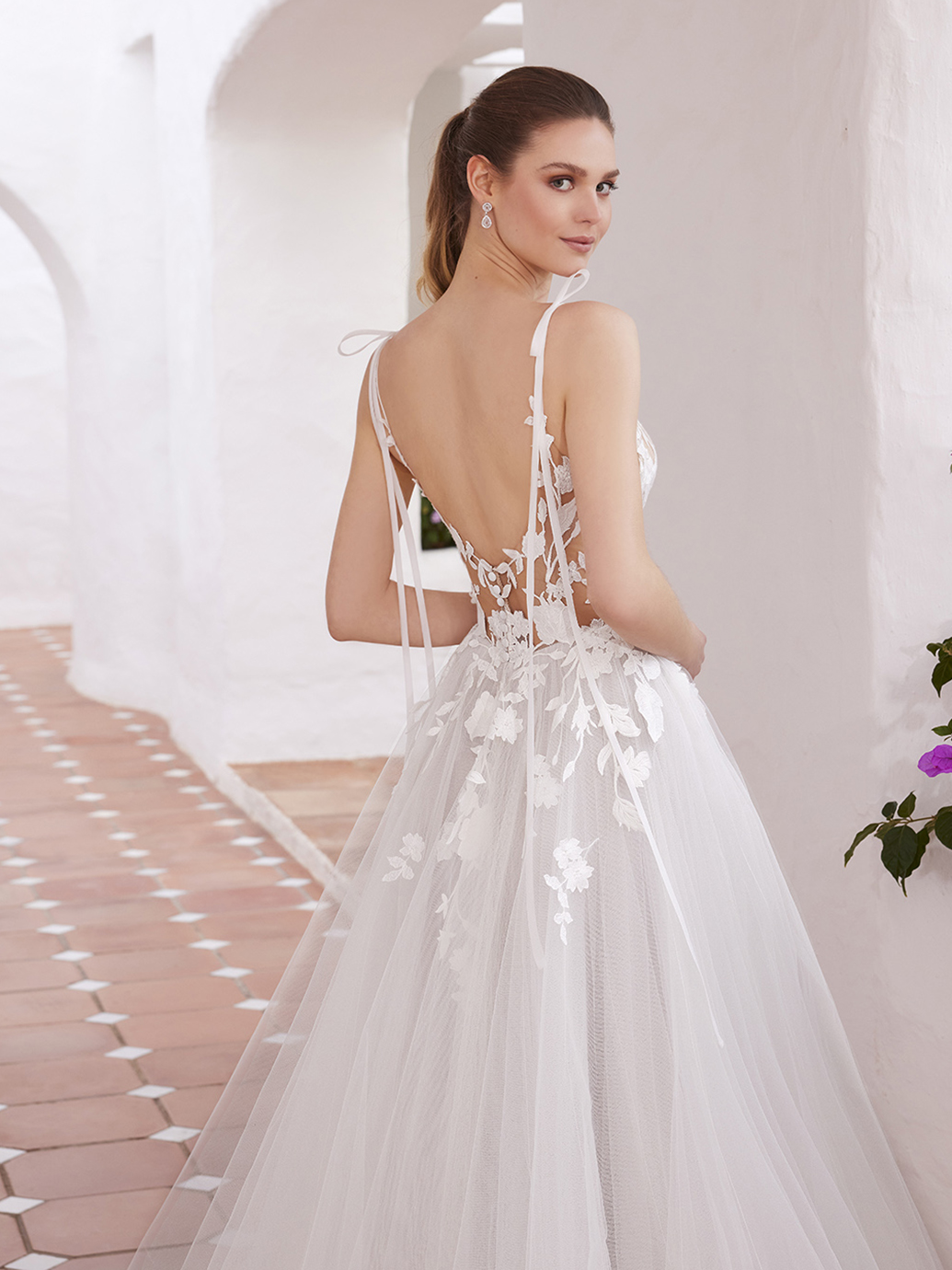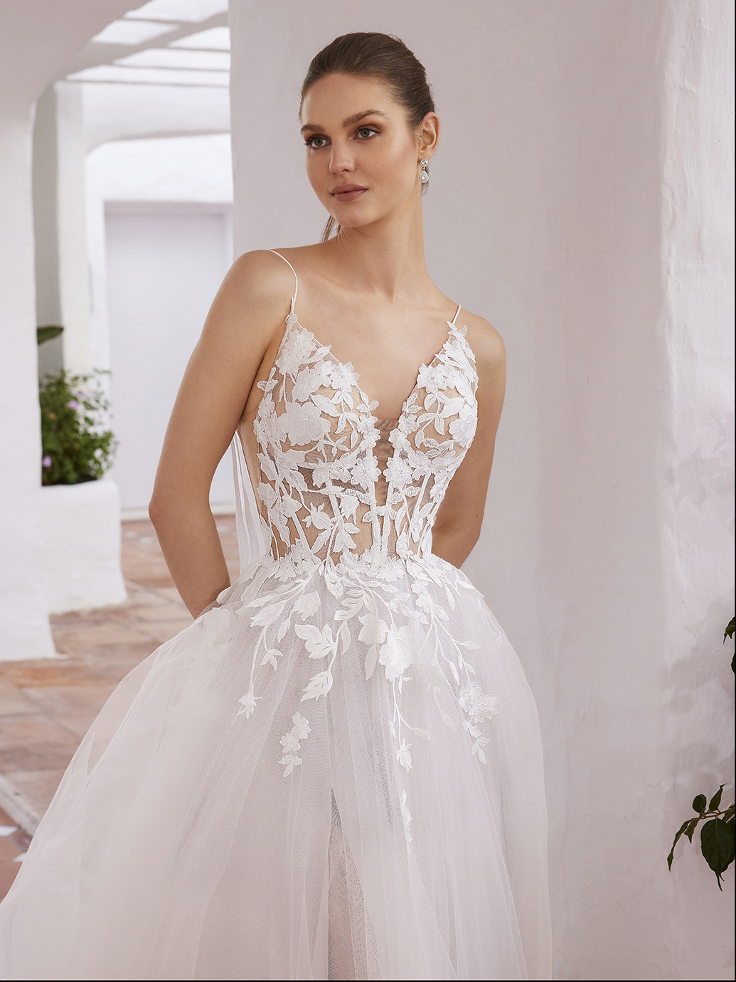 Verwirklichen Sie all Ihre bezaubernden Brautträume mit CLOVER. Dieses zauberhafte A-Linien-Kleid verfügt über wunderschöne botanische Spitze entlang des V-Ausschnitts und ein Illusionskorsett-Oberteil, das sich in den luftigen Tüllrock fortsetzt. Die ultradünnen Spaghettiträger sind mit zierlichen Bindedetails versehen, die für einen verträumten Touch sorgen. Der geschmackvolle Guck-Schlitz und die V-förmige Rückseite aus Illusionsspitze vervollständigen diese atemberaubende Schönheit.