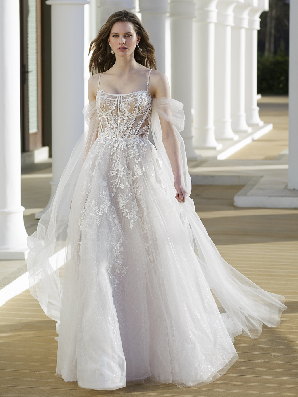 Truly romantic in every detail, this jaw-dropping A-line gown has us in love. From the delicate beaded spaghetti straps to the dazzling beaded floral lace on the corset style bodice, this magical dress is unforgettable. The detachable tulle straps and hidden peek-a-boo slit with the glitter tulle adds a whimsical and dreamy effect. The illusion corset-style back with detailed sequined floral lace is ever-so elegant, finished with an entrancing tulle skirt.
