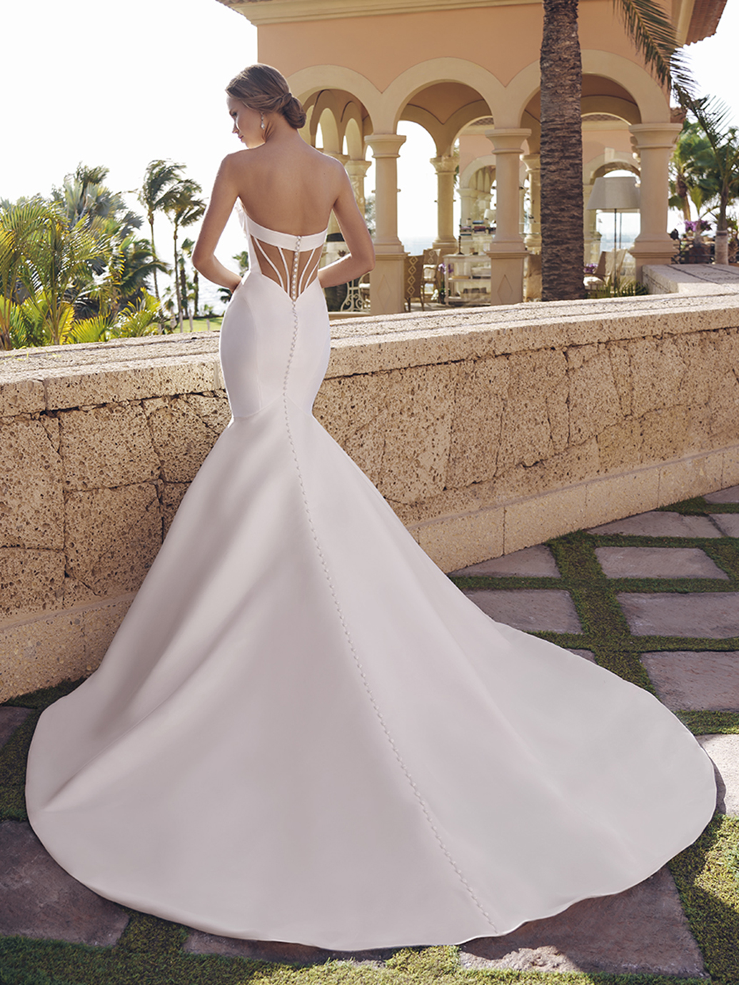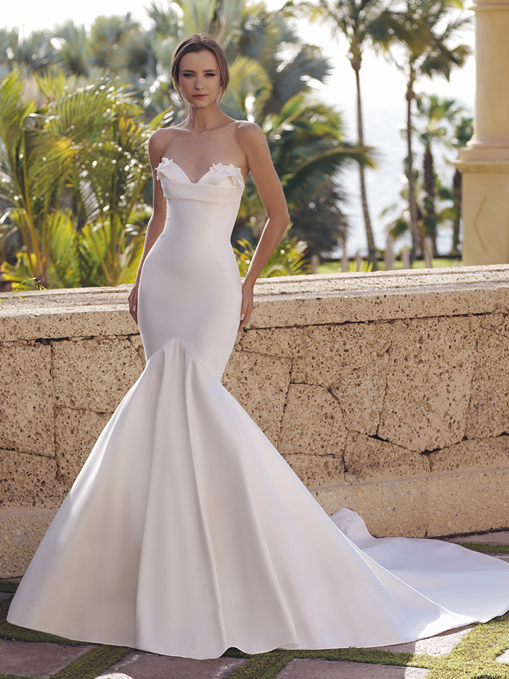SALLY is a sleek and breathtaking mermaid wedding dress available in Mikado or satin. Its delicate, detachable off-the-shoulder straps and long illusion sleeves are beyond dreamy with 3D Mikado floral appliques and 3D organza floral petals. Fit for a princess, this stunner will have you looking effortlessly snatched on your special day.