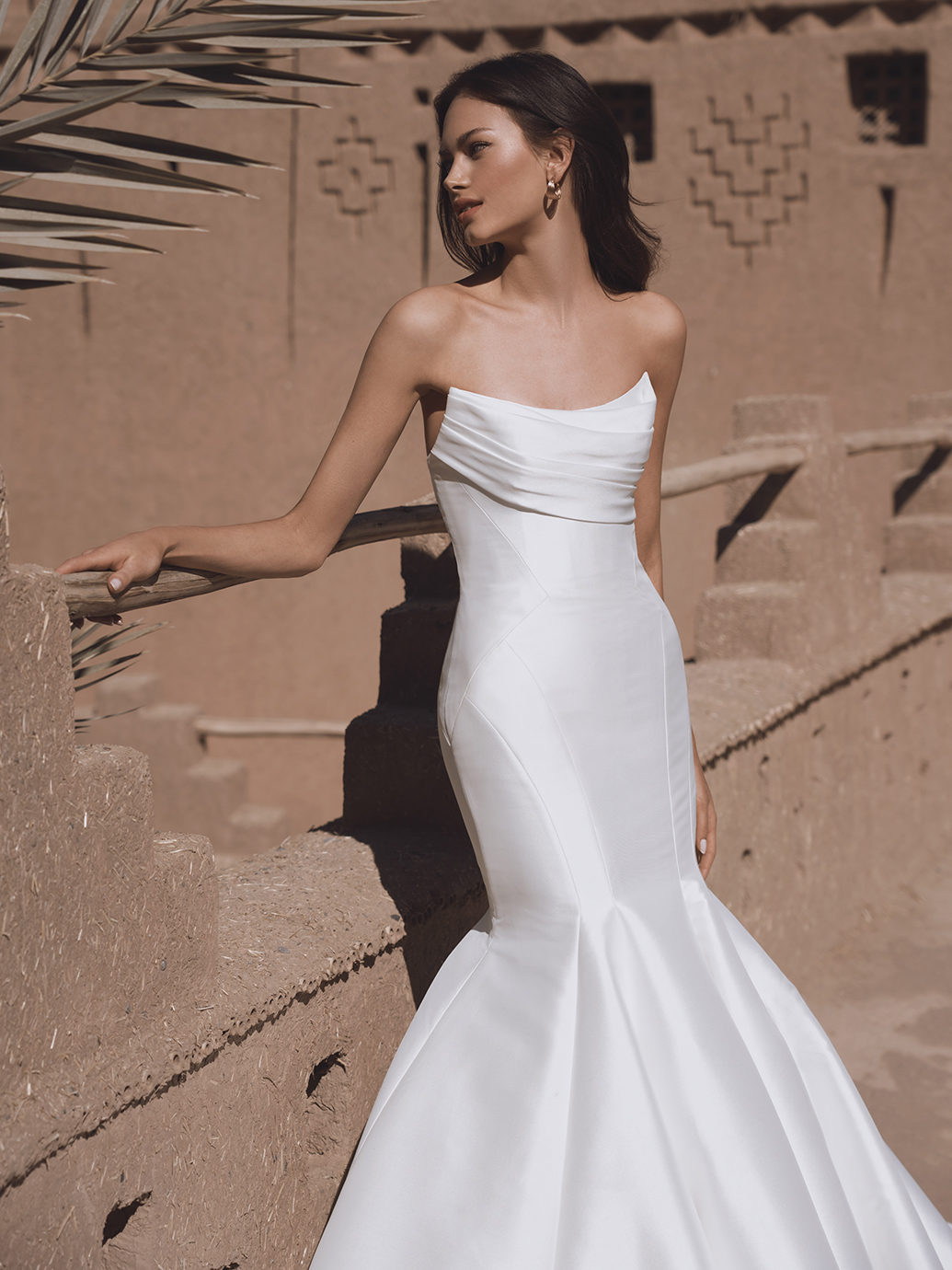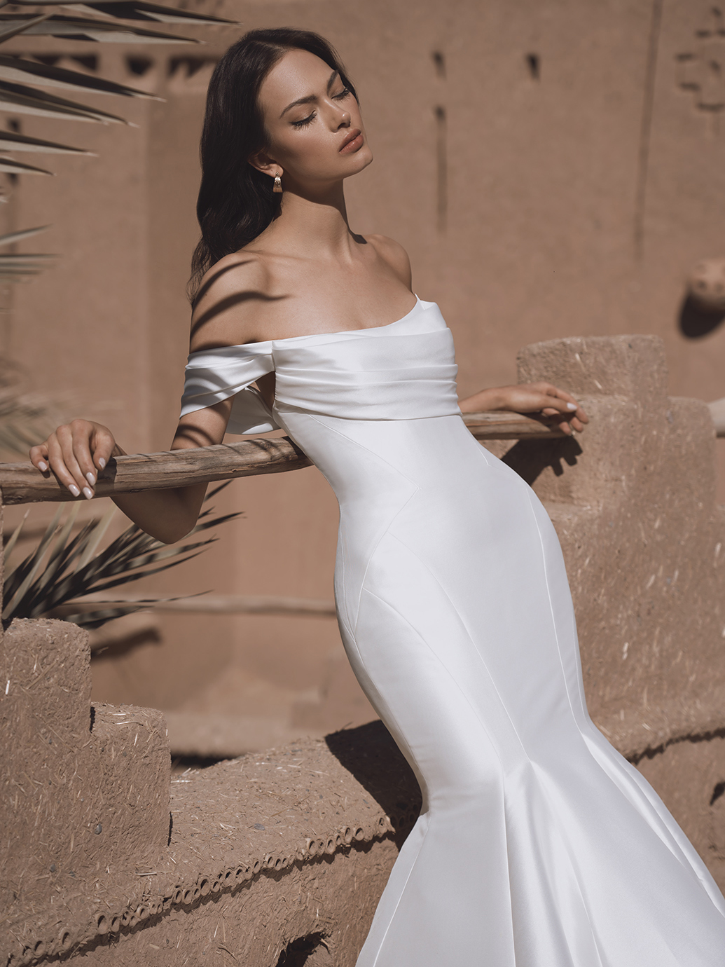 Presenting the sleek TATUM wedding gown. Crafted from luxurious mikado or satin, this trumpet silhouette gown is a sculptural dream. The ruched scoop neckline adds a modern touch to the classic design, while the detachable off-shoulder straps offer versatility for the modern bride.
