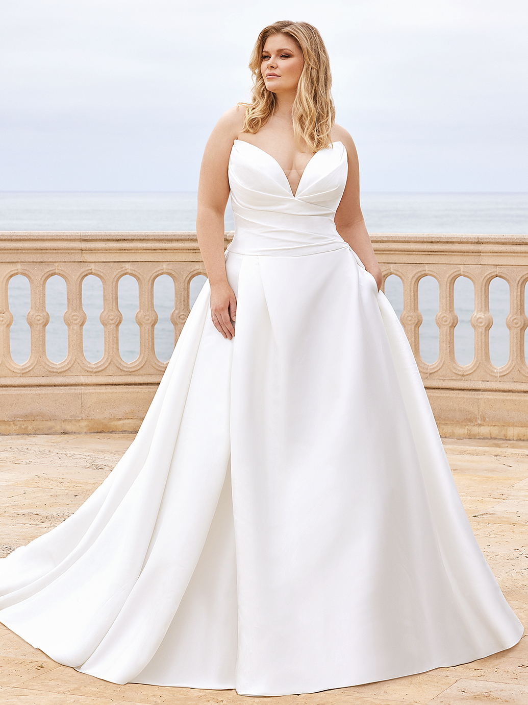 For our minimalist brides, BANCROFT x Édition is a classic Mikado ball gown with an alluring draped sweetheart neckline bodice with raised back bodice for support, elegant covered buttons trailing down the back to the hem, and a sexy skirt slit for the ultimate chic wedding look. And the cherry on top? This gorgeous gown is a wedding dress with pockets!