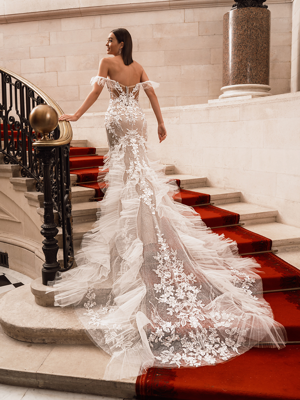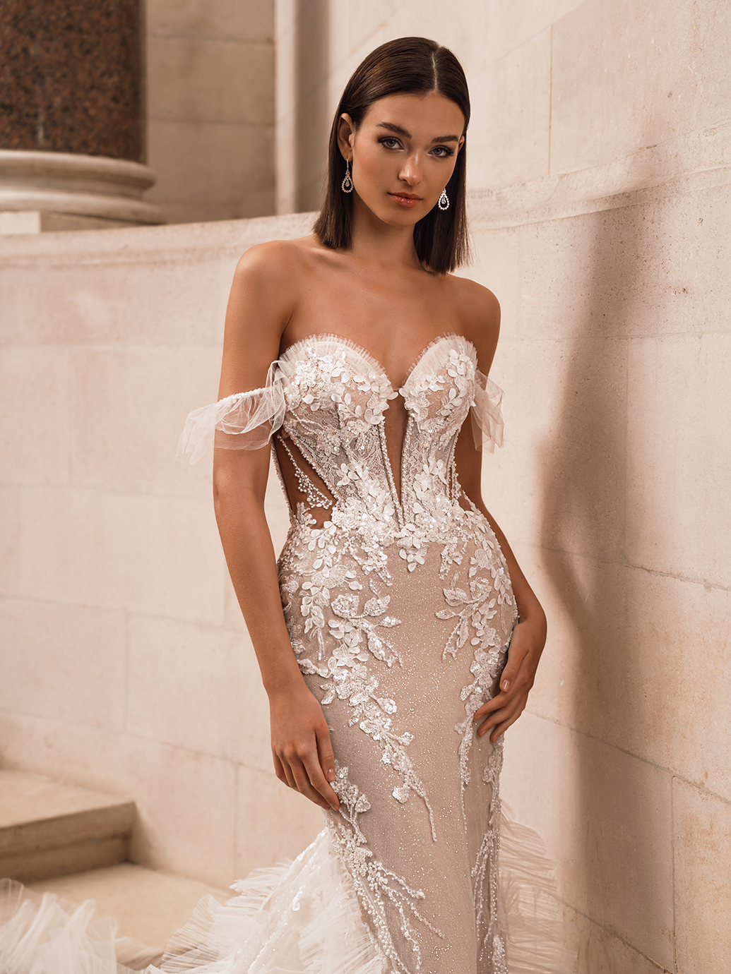 Bring the drama as you walk down the aisle in FAWNE! This whimsical mermaid gown showcases sweet tulle frills on the top of the sweetheart neckline bodice with matching ruffled, detachable off-shoulder straps, dazzling beaded linear lace, and exposed boning on the sparkling floral lace bodice for a unique bridal look. Eye-catching 3D Mikado leaf lace trickles from the bodice down to the fantastic ruffled tulle train to bring an even more glamorous look.