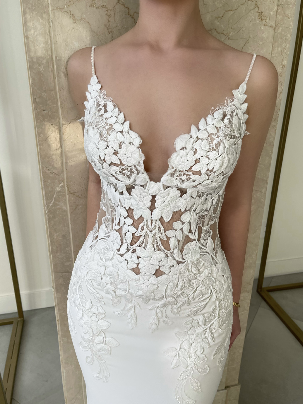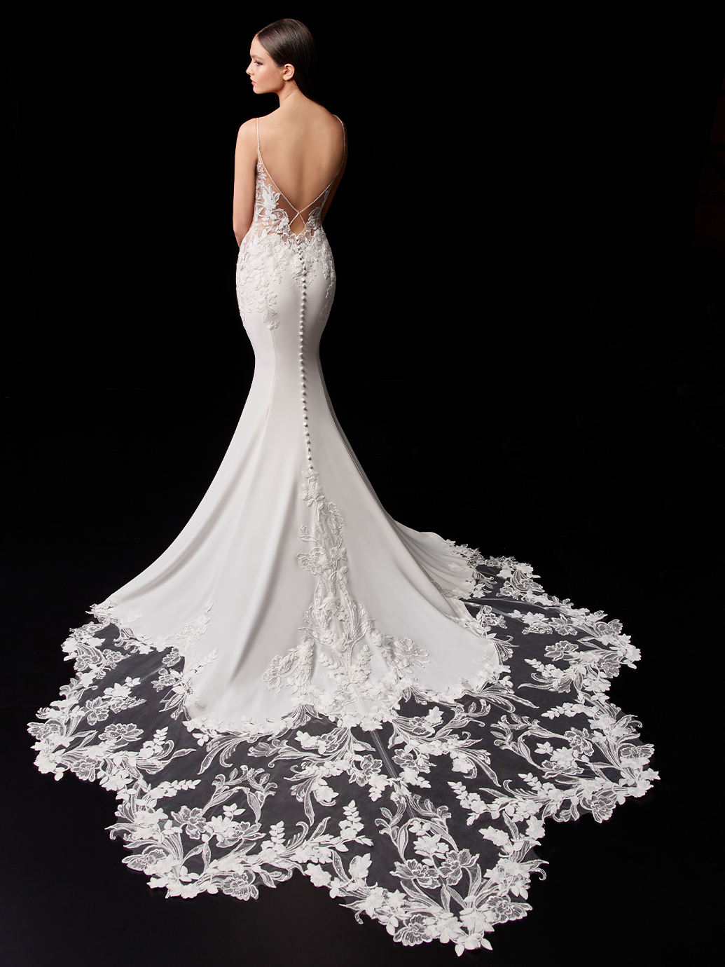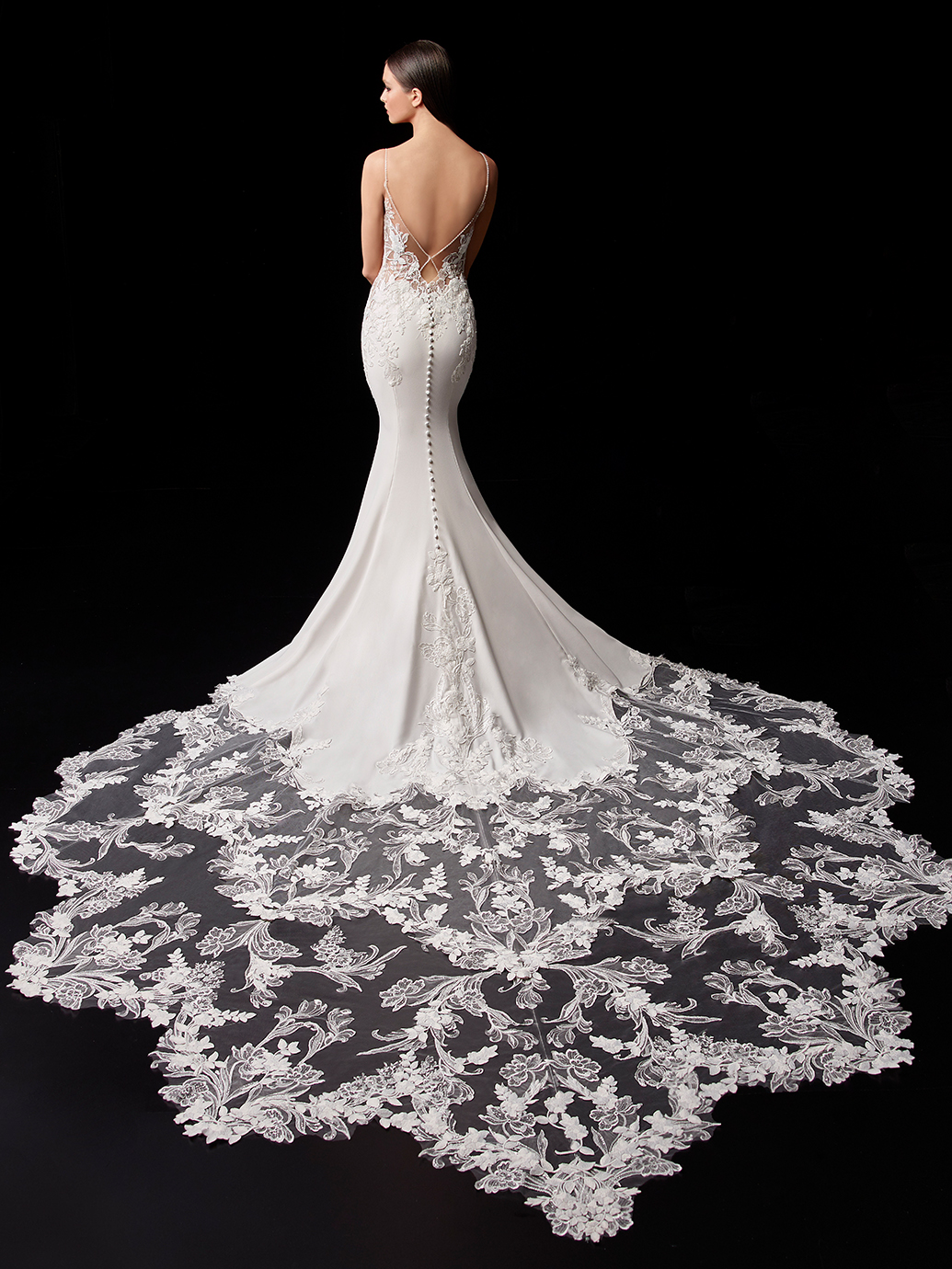 PEARL is the epitome of the goddess divine. The floral embroidered lace is perfect for the bride who loves the romance of the traditional floral design but wants a contemporary, bold 3D effect. The rest of the gown is constructed with stretch georgette for the utmost comfort while flattering the figure. Want to step it up another gorgeous notch? The detachable cape is made of light chiffon and has the same gorgeous detailed lace train as the gown. Speaking of trains, PEARL also features Enzoani's signature long train -- except this time, it's detachable! The removable train is ideal for those heart-stopping back photos and dramatic entrances. When it's time to dance the night away, you can opt to detach it and showcase a shorter train for an effortless night you'll never forget.