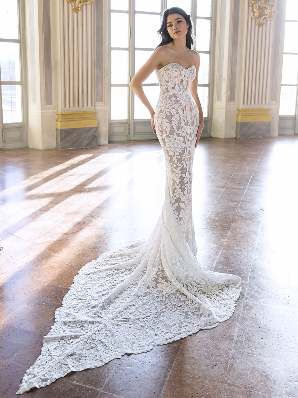 Where modern meets vintage, TAYLOR is a mermaid gown featuring a new embroidered Chantilly lace design with vintage motifs on a classic strapless sweetheart neckline. The corset boning trickles all the way down past the lingerie-style tailored bodice, giving the body an elongating effect. The dainty bow belt and heart-shaped sculpted train add a romantic touch to this sweet silhouette.