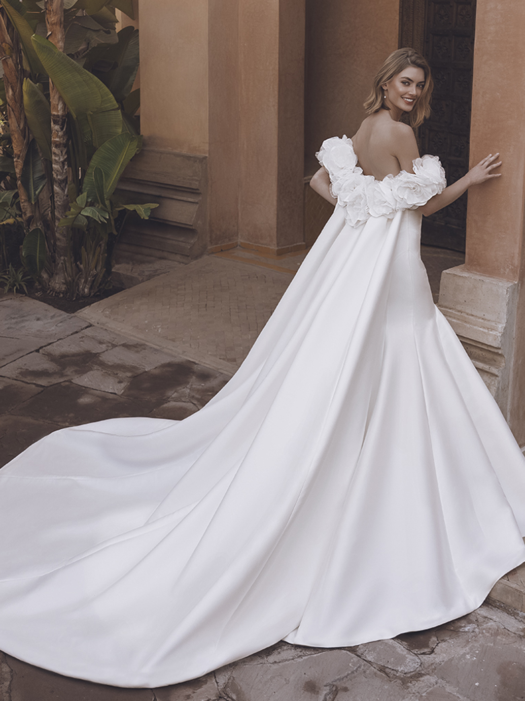 Elevate your bridal style with the chic UMARA Mikado mermaid gown, featuring an artfully draped sweetheart neckline bodice and clean lines. The dramatic trumpet skirt is eye-catching and oh-so-stunning with a regal, extended train. Its detachable off-the-shoulder cape adorned with jaw-dropping 3D flowers slides onto the arms to make an effortlessly breathtaking statement. It is the perfect piece to transform your bridal look into something unforgettable.