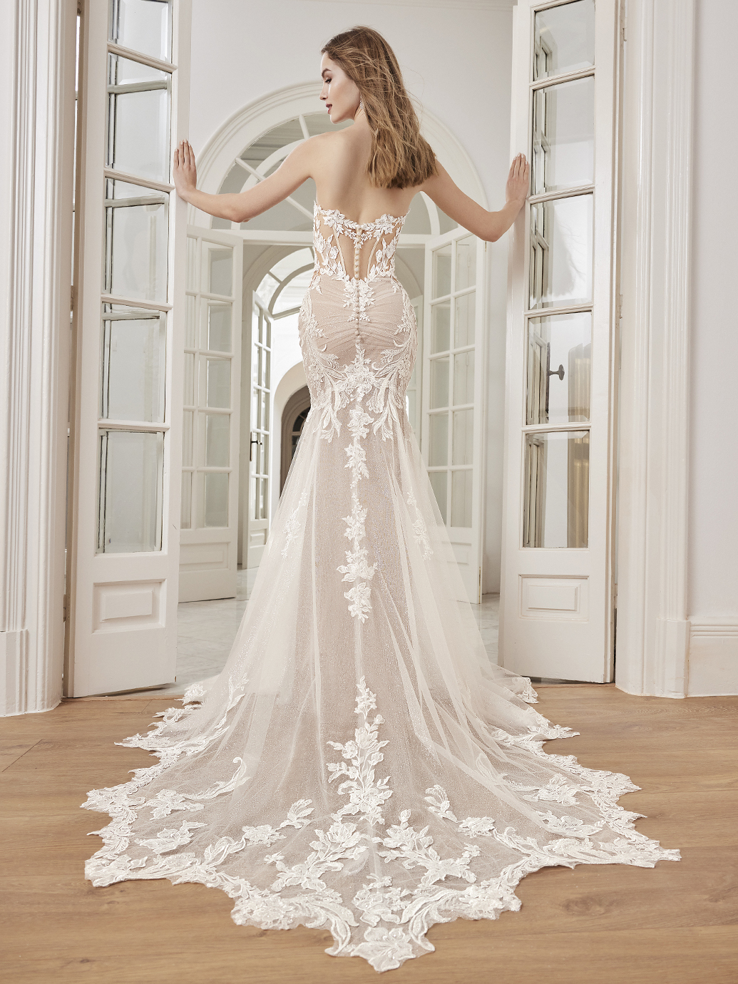 This captivating mermaid wedding dress showcases everything we want in a gown and more! CHEYENNE is enhanced with multiple layers of beaded baroque and floral lace over full sparkling tulle and detachable flirty off-the-shoulder ruffle sleeves for an ultra-romantic, flirty look. The sparkling embroidered lace and illusion side cut-outs are sure to flatter the figure alongside the sparkly tulle skirt that trails down into a stunning sculpted train.