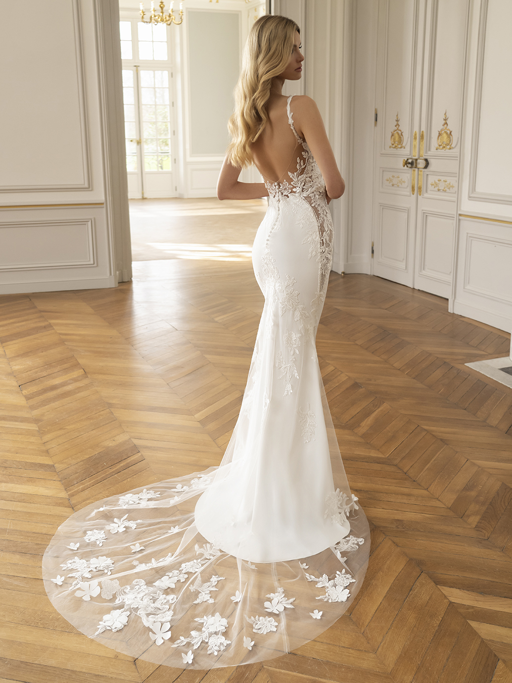 Sophisticated romance! ELENA features a sparkling floral embroidered lace and beaded linear lace bodice with delicate 3D Mikado floral applique straps. The sequin tulle side cut-outs add a figure-flattering extra dose of glamour that will leave your wedding guests stunned. This elegant gown also features an embroidered lace tulle overlay over the sleek crepe skirt to create the perfect amount of dreamy drama as you walk down the aisle.