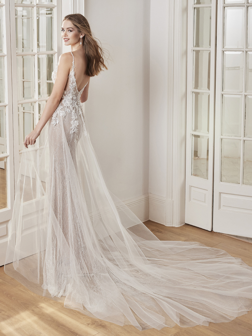 For brides who want an ultra-sparkly gown, GUINEVERE is here to make you shine! This dazzling A-line wedding dress features sparkling floral lace and 3D floral appliques on the bodice with a V-neckline and delicate beaded straps. The intricate floral lace cascades down into the shimmery soft tulle outer layer over the Chantilly lace skirt with a high slit for the dreamiest look.