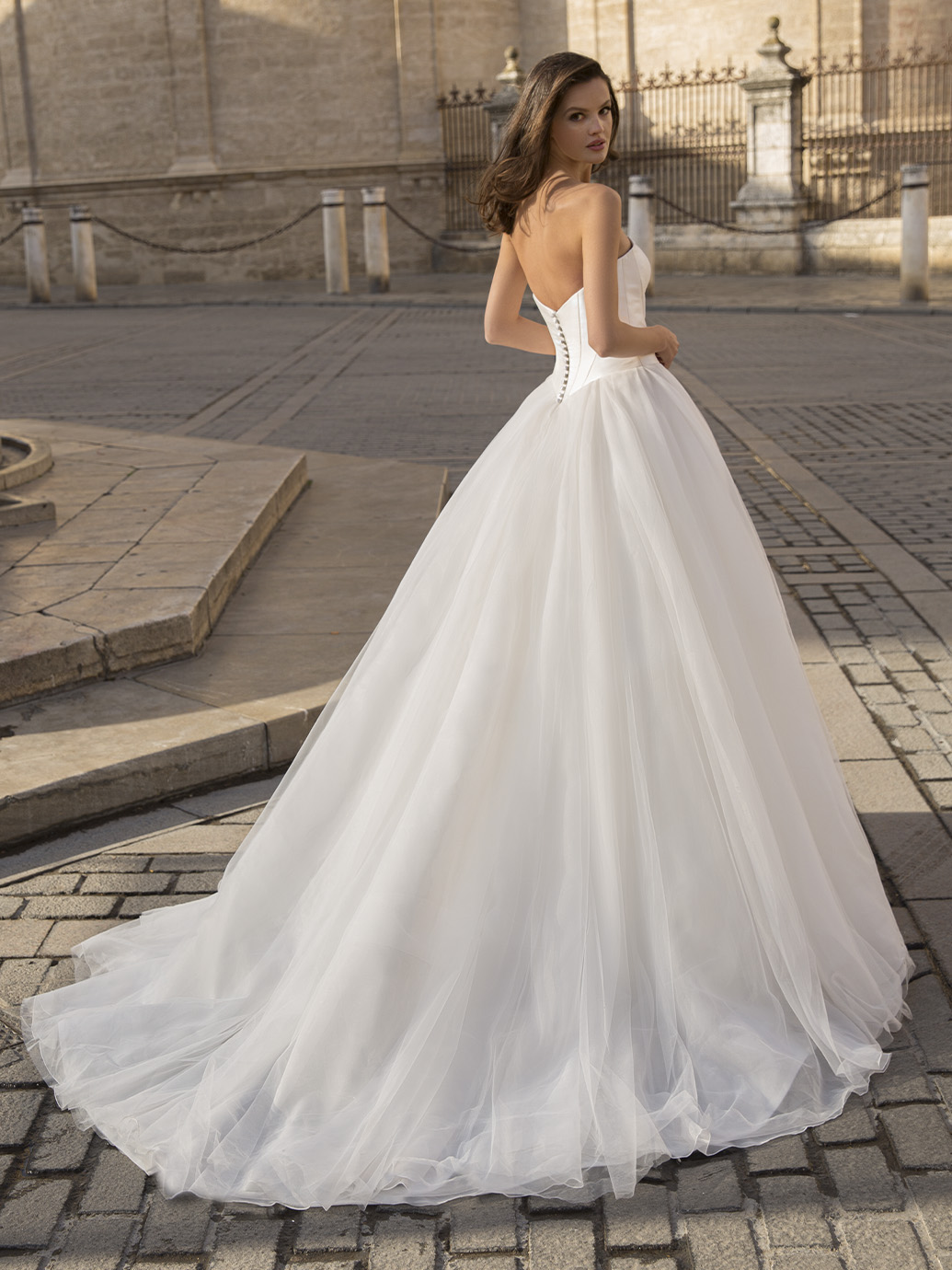 If you’re looking to enchant your guests, VALENTINA is the gown for you! This fairytale wedding dress features a Mikado bodice that flows down into a voluminous, soft tulle skirt for an ultra-romantic, regal look. The classic curved neckline with body-contouring seaming is figure-flattering and supportive for you to dance all night. The beautiful drop waist adds to the dramatic ball gown effect with a lovely classic look to it.