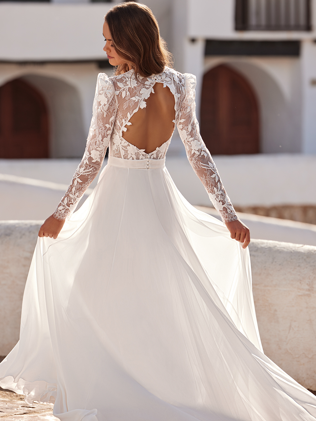 The DANA gown features a mesmerizing bodice adorned with delicate floral embroidered lace and Chantilly lace, exuding regal sophistication. The ethereal combination of tulle and chiffon in the skirt creates a whimsical silhouette that floats with grace and movement. Its lace long sleeves, complemented by its puff shoulder detailing and a high neckline, add a vintage spin on this modern gown.