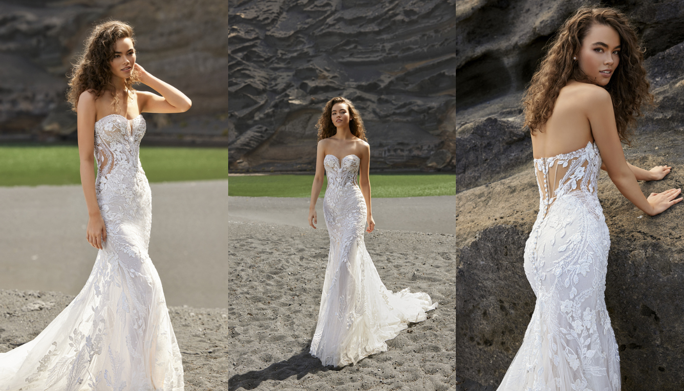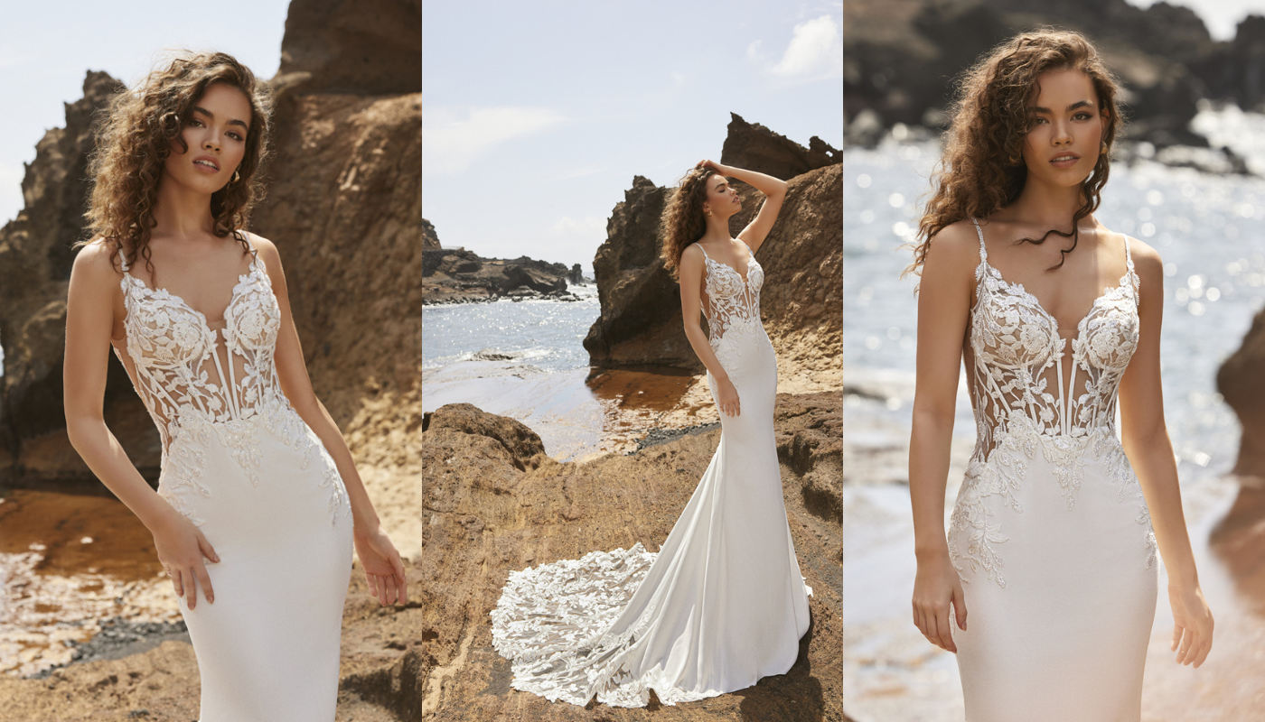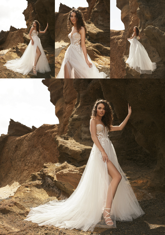 The TRINA gown features a flowing A-line silhouette that moves gracefully with the ocean breeze. This design not only looks stunning in photos, but also provides ease of movement, essential for walking on sandy beaches. TRINA's design includes delicate lace detailing and a romantic, ethereal feel that complements the natural beauty of a beach setting. The intricate lace appliqués add a touch of elegance without overwhelming the simplicity and natural charm of the gown.