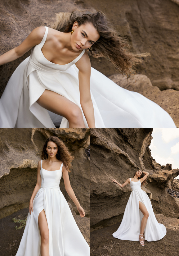 ROSABEL offers a timeless twist on the traditional gown, featuring a contemporary A-line silhouette in Mikado fabric. Designed with a curved neckline and thick straps for optimal support, its sultry open corset-style back adds allure. This gown fits like a dream, and is designed to flatter the figure. Not to mention, it includes pockets! This chic and clean bridal style is completed with a front slit and delicate cascading buttons.