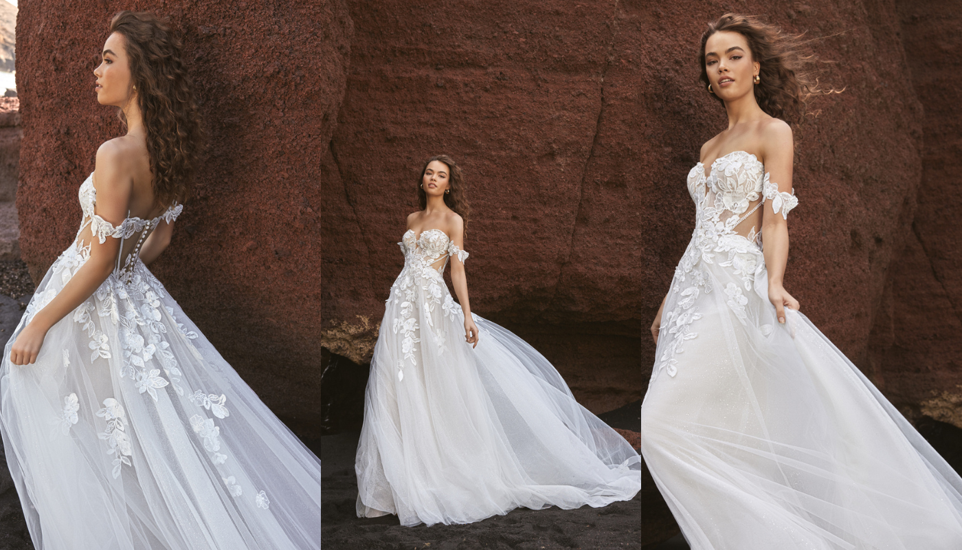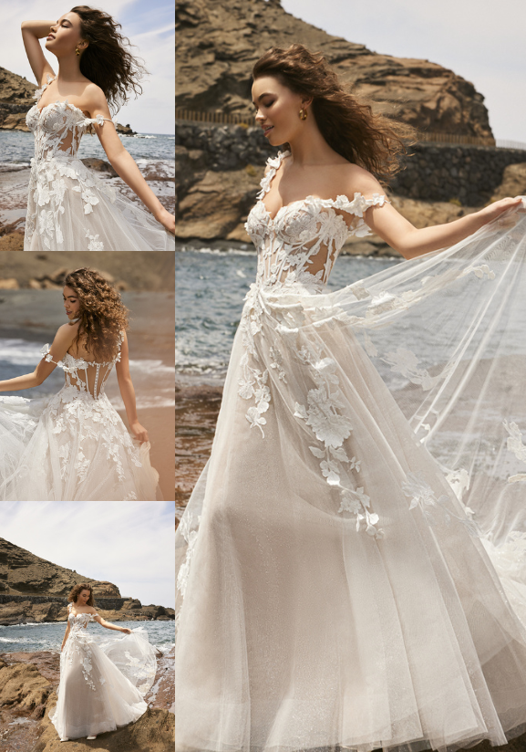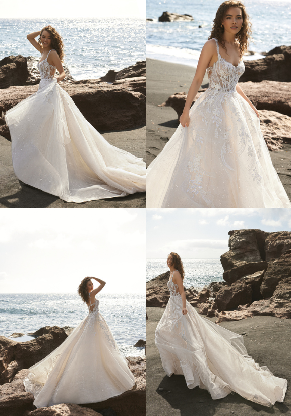TIARA combines the grandeur of a ball gown with the charm of a beach destination wedding, offering a blend of luxury, romance, and photogenic appeal that makes it a standout choice for brides seeking a memorable and elegant beach wedding dress. The voluminous ball gown silhouette creates a striking contrast against the natural backdrop of the beach, making a bold statement and ensuring you'll effortlessly stand out. Wearing an opulent ball gown like TIARA can make you feel like royalty, enhancing the destination wedding experience.