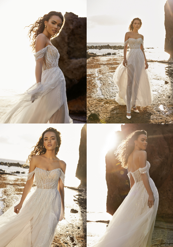 TESSA's intricate beadwork and embellishments on the gown will sparkle and shimmer beautifully in the golden hour sunlight, creating a mesmerizing effect in photos. The glamorous design of the gown adds a touch of luxury and sophistication to the beach setting, elevating the overall atmosphere and complementing the warm, golden hues of sunset. A beaded gown exudes elegance and glamour, creating a memorable bridal look that contrasts beautifully with the relaxed and natural ambience of the beach. It offers a unique blend of opulence and nature, making the wedding day truly special.