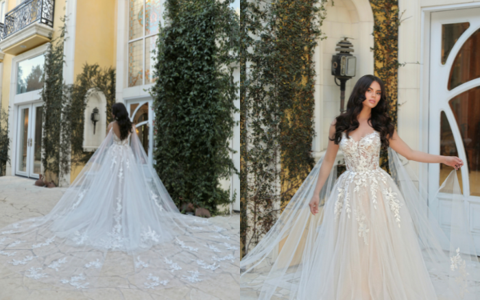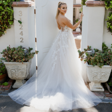 A playful and airy dress, perfectly made to glide down the aisle. This romantic, dreamy A-line wedding dress features embroidered floral lace on top of sparkly glitter tulle that falls down into a lovely tulle skirt with delicate lace appliques. The open V-back complements the detachable split cape for an ethereal bridal look as you glide down the aisle.