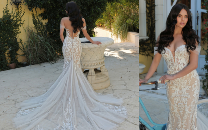 Made for our modern-with-a-nod-to-traditional brides, this curve-hugging mermaid gown features detachable off-shoulder tulle straps gorgeously draping from an illusion lace bodice. The floral lace beautifully adorns the corset-style back for an eye-catching touch.