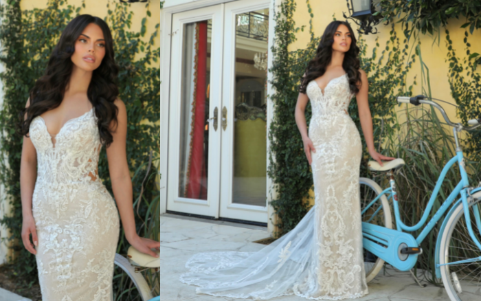 Sweet and striking, this mermaid beauty blends Chantilly lace and tulle for a delicate bridal look. This figure-flattering gown features a deep sweetheart neckline, body-contouring side panels, and an illusion lace back for a stunning effect.
