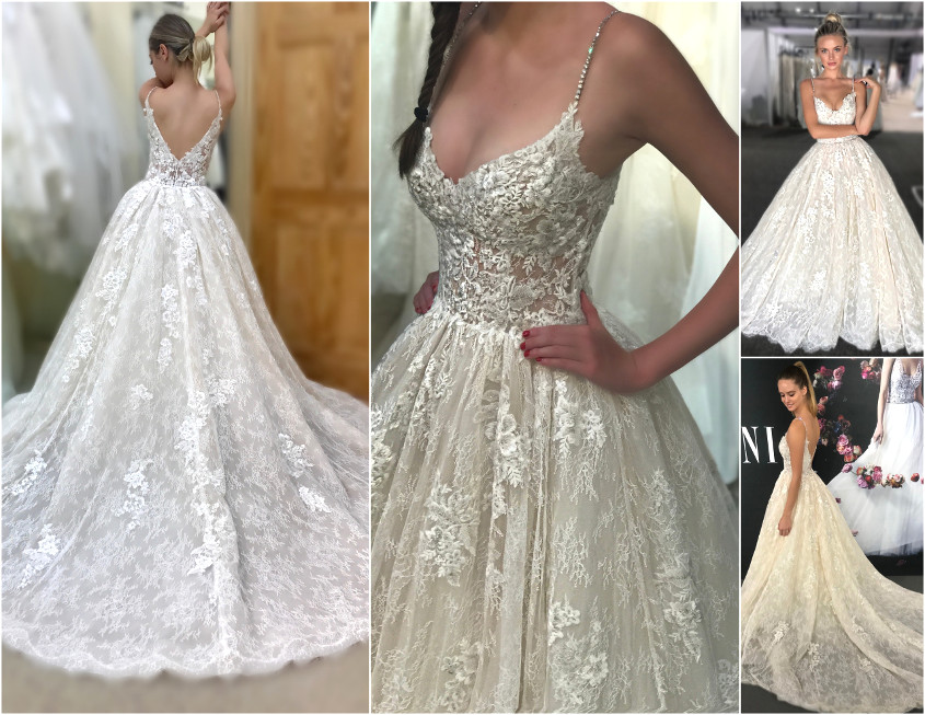 A showstopper of a back showcases a low illusion design embellished with criss-cross rhinestone straps and the most jaw-dropping, tiered lace and tulle train.