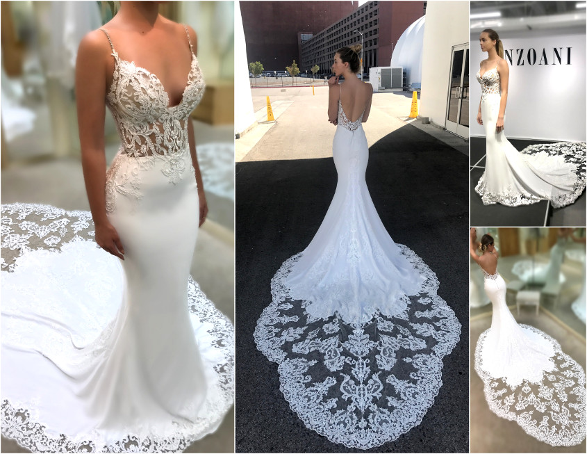 17 yards with 6 different sweet lace appliqué designs allow for the most exquisite, intricate look in the subtlest way. A low illusion back adds even more sexiness, while the gorgeous back lace panel becomes an elegant lace train to complement the sleek stretch georgette mermaid skirt.
