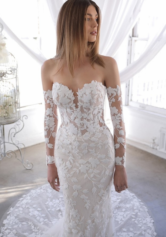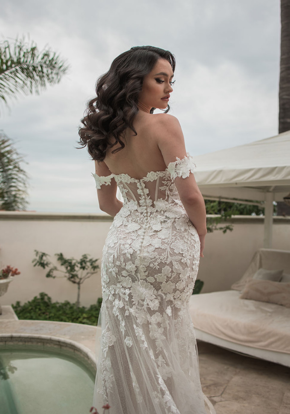 While still showing off that sexy mermaid sillhoute, RAQUEL remains a soft and sweet, romantic look with her mix of shimmery beaded floral lace and the subtle dimensional leaf embroidered lace.