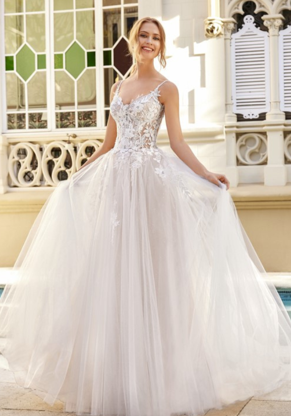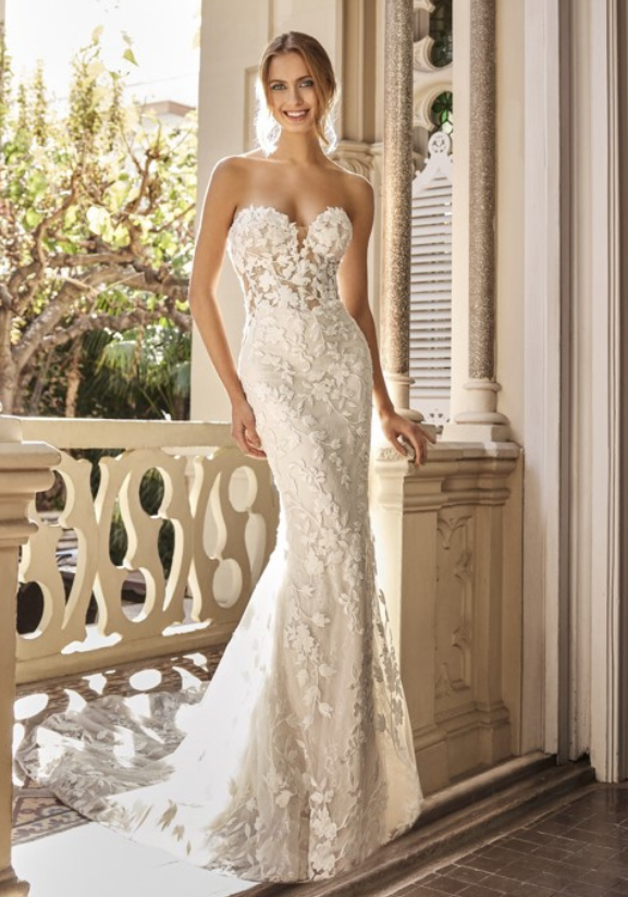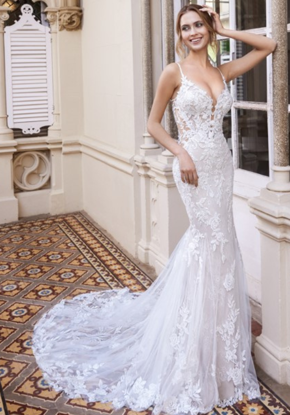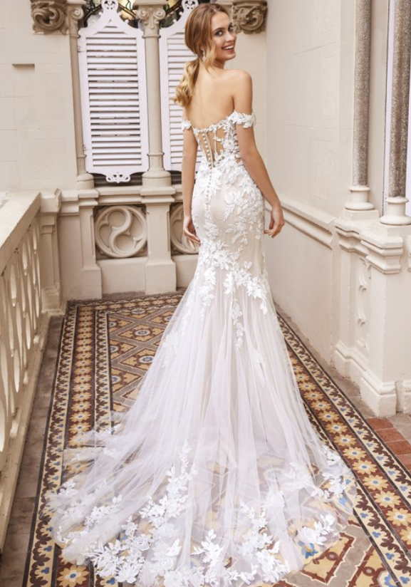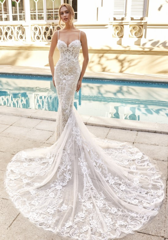 This mermaid beauty has stolen our hearts with its beloved, thick floral lace that is unlike any other. The sweetheart neckline, corset-style back, and side cut-outs all combine to create a stunning look that is unmatched. You can complete this gorgeous look with long, detachable off-shoulder sleeves for an elevated style.