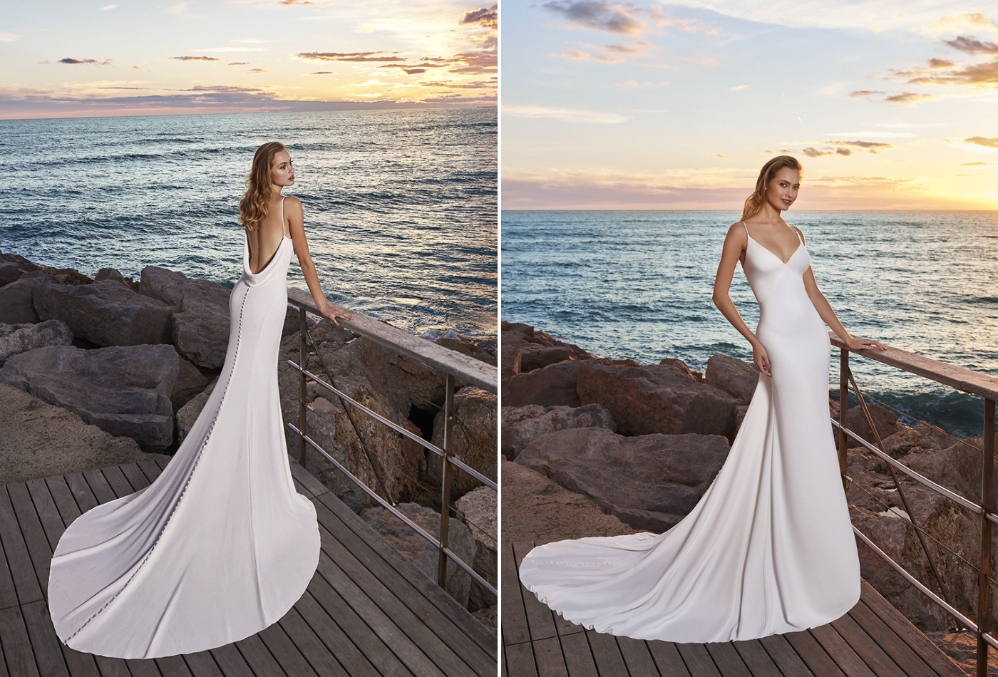A sexy and minimalist take on bridal, this matte crepe gown is light and oh-so flattering. The V-neck bodice and gorgeous cowl back with lace detailing will catch eyes, as it cascades down into a scalloped lace train. The button detailing and beaded baroque lace complete this striking gown for a lovely touch.