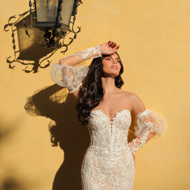 Romance in every detail... ALEXA showcases delicate embroidered floral laces with a classic sweetheart neckline. The illusion corset back cascades down into a soft tulle skirt hemmed with matching lace appliques. This sweet gown also includes matching detachable long sleeves for an extra romantic touch.