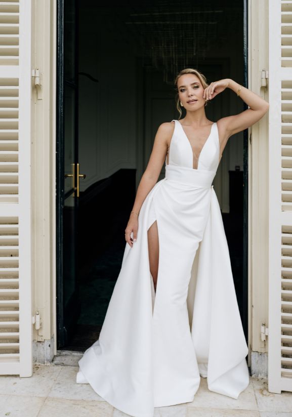 This sleek Mikado gown features a plunging neckline with a ruched and fitted skirt featuring an alluring high slit. The full A-line detachable overskirt gives you two looks in one, giving you an easy outfit change option to dance the night away in. The open V-back and delicate buttons finish this modern bridal look.