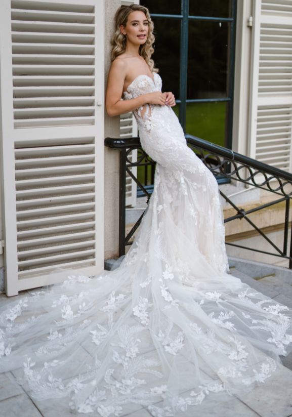 This glamorous mermaid silhouette features 3D floral embroidered lace, beaded feathery lace motifs, and exquisite leaf ornaments adorned with voluminous flowers and beading to add luxurious details all over the gown.