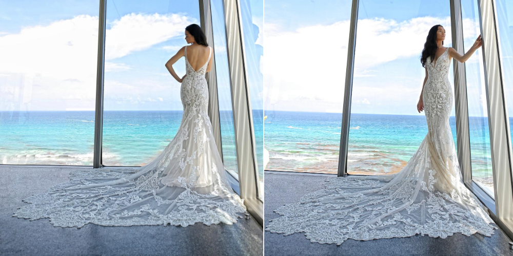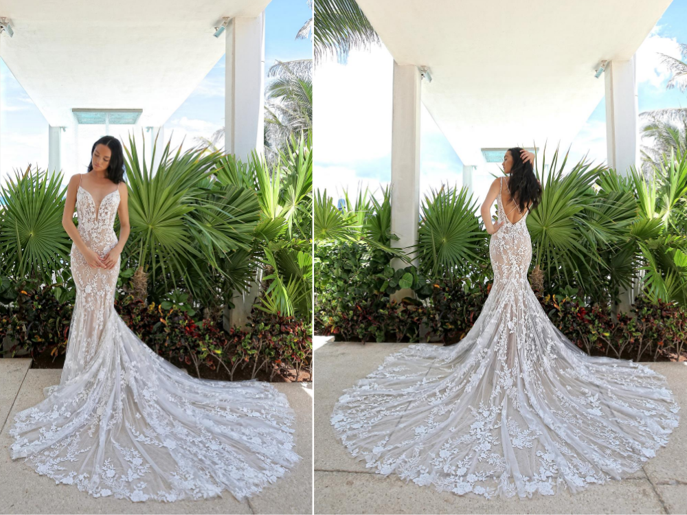 OLYVIA is a gorgeous mermaid gown with the perfect lace and train. We love its regal pattern as it takes a break from bridal's floral lace that we often see. Updated with modern patterns, OLYVIA is a sure winner in many books.