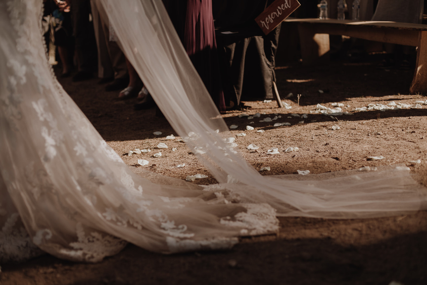 I knew our entire wedding would be outside - from our ceremony in the forest (with a dirt aisle) and the reception on cement and grass, so I wanted a dress that would match our natural setting, but at the same time still be elegant.