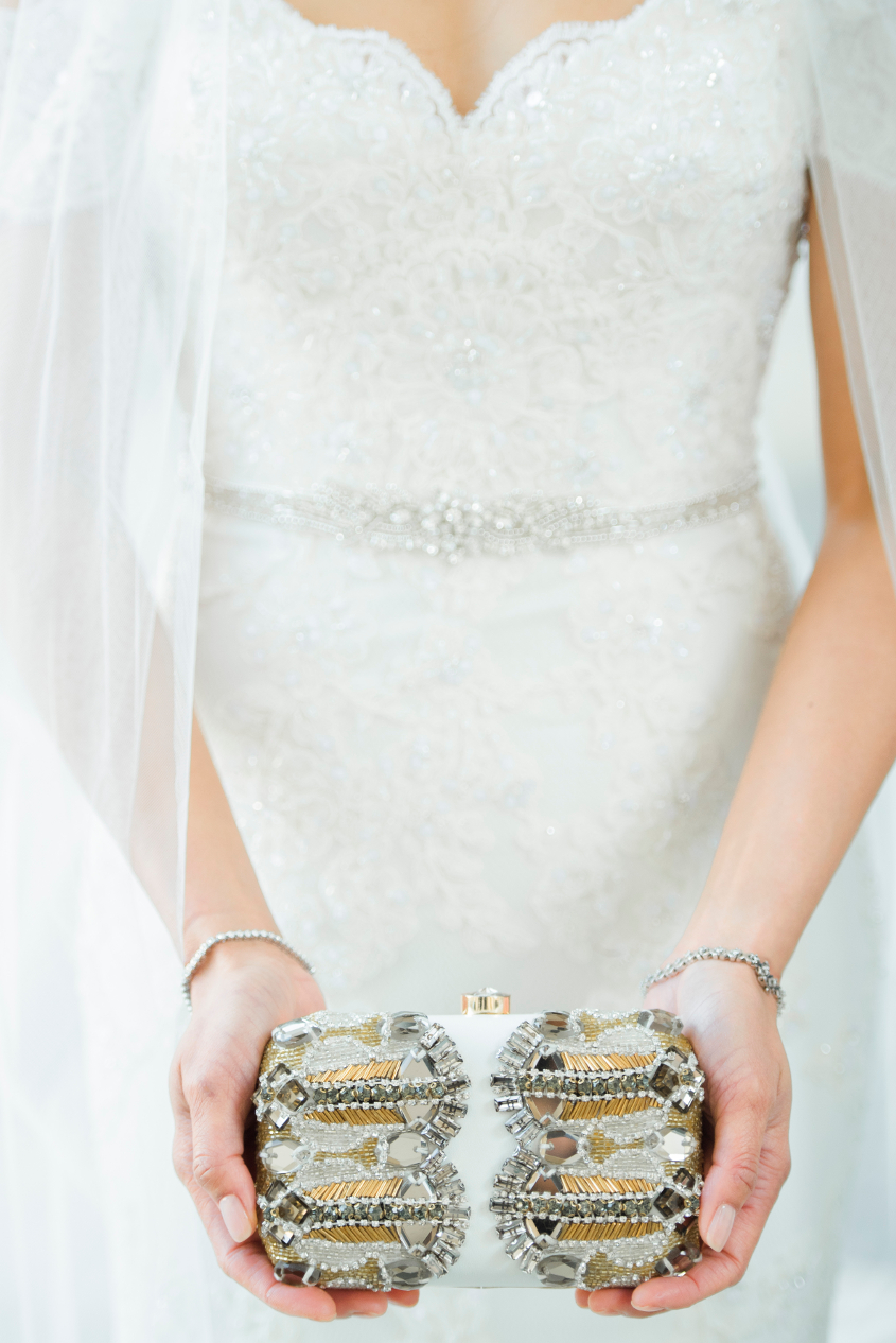 For the ceremony, I ordered the Jacket-X with matching lace, and for the reception, I ordered the Ivory Belt-Z, an intricate and glamorous, beaded Alchemy clutch, and custom off-the-shoulder ivory lace sleeves, all by the beautiful Enzoani.